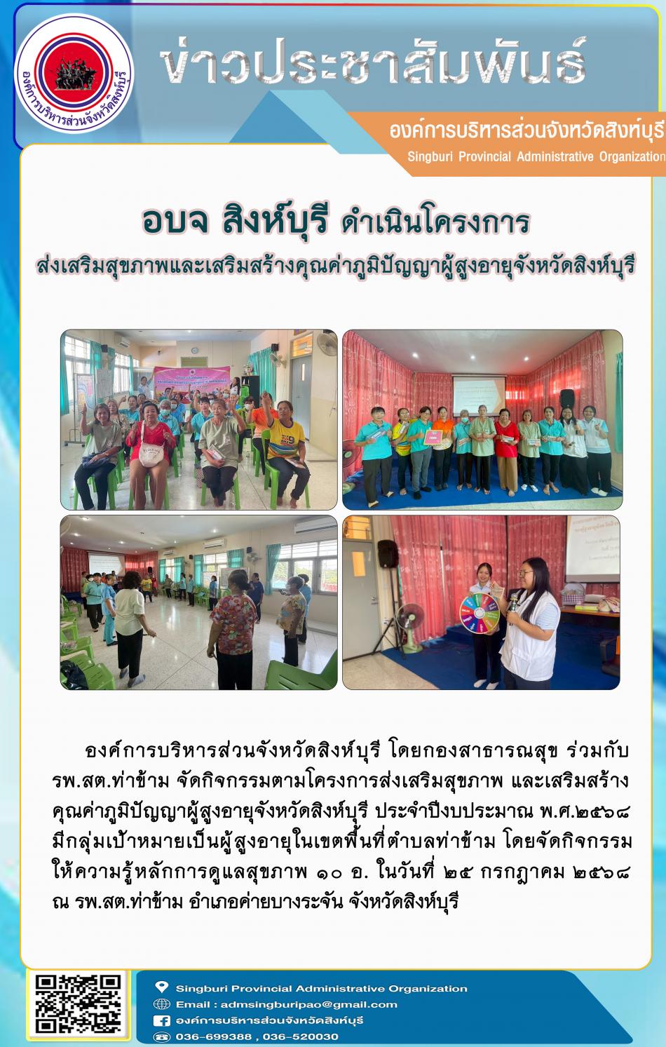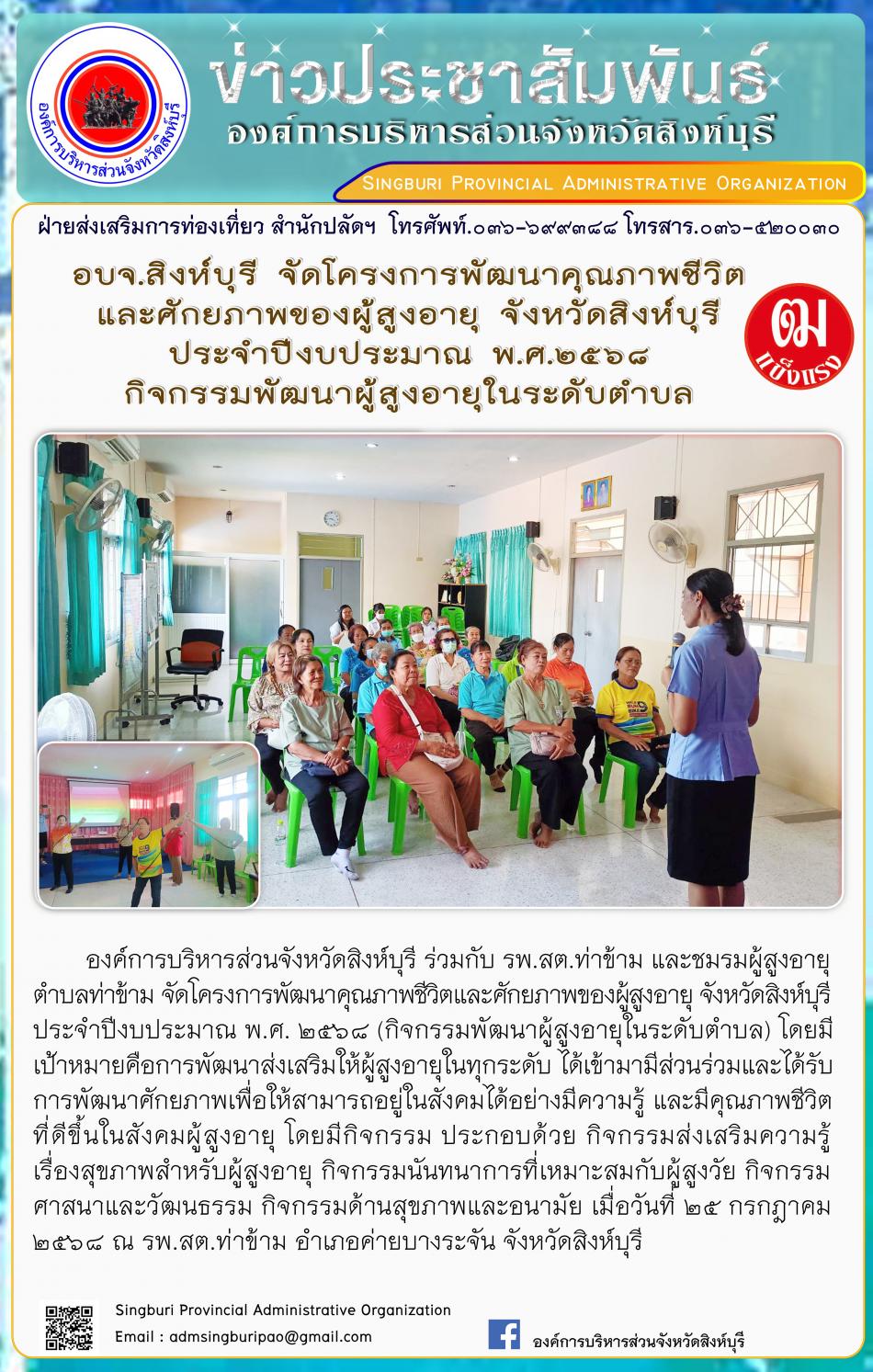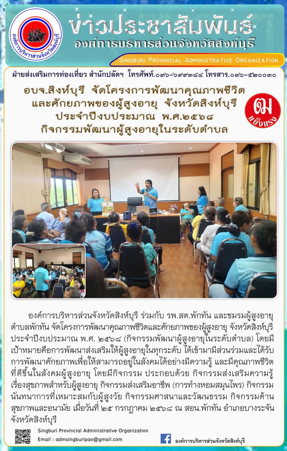 อบจ.สิงห์บุรี จัดโครงการพัฒนาคุณภาพชีวิตและศักยภาพผุ้สูงอายุจังหวัดสิงห์บุรี ประจำปีงบประมาณพ.ศ.2568 กิจกรรมพัฒนาผู้สูงอายุในระดับตำบล [25 กรกฎาคม 2568]