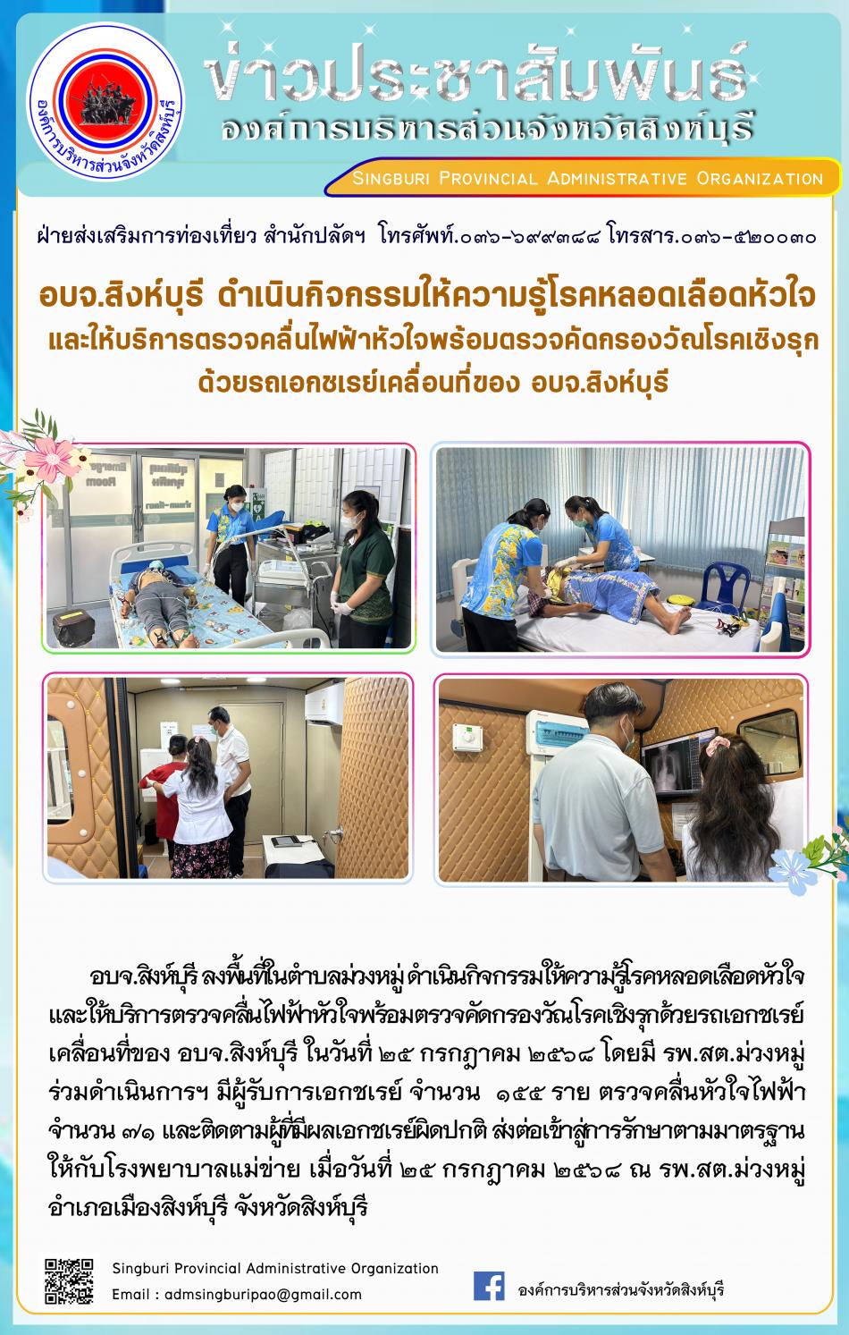 อบจ.สิงห์บุรี ดำเนินกิจกรรมให้ความรู้โรคหลอดเลือดหัวใจและให้บริการตรวจคลื่นไฟฟ้าหัวใจพร้อมตรวจคัดกรองวัณโรคเชิงรุกด้วยรถเอกซเรย์เคลื่อนที่ของ อบจ.สิงห์บุรี [25 กรกฎาคม 2568]