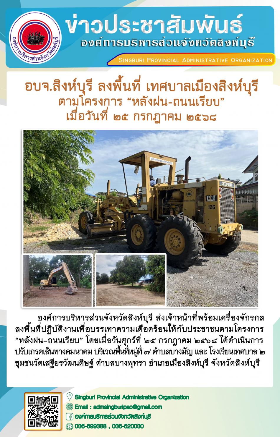 อบจ.สิงห์บุรี ลงพื้นที่ เทศบาลเมืองสิงห์บุรี ตามโครงการ "หลังฝน - ถนนเรียบ" [25 กรกฎาคม 2568]
