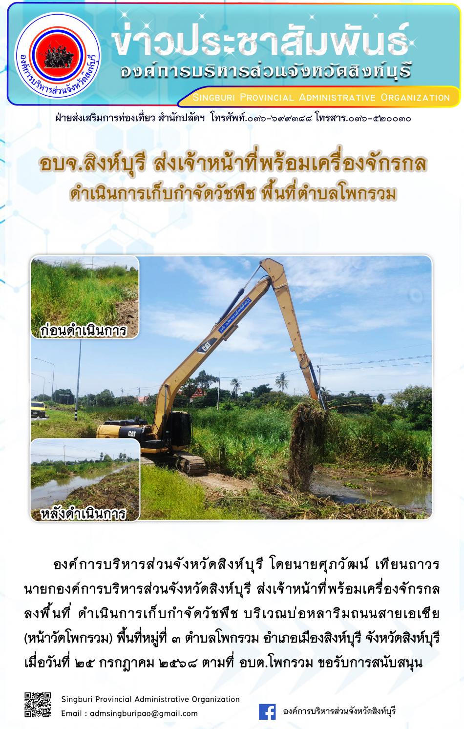 อบจ.สิงห์บุรี ส่งเจ้าหน้าที่พร้อมเครื่องจักรกล เก็บกำจัดวัชพืช พื้นที่ตำบลโพกรวม [25 กรกฎาคม 2568]