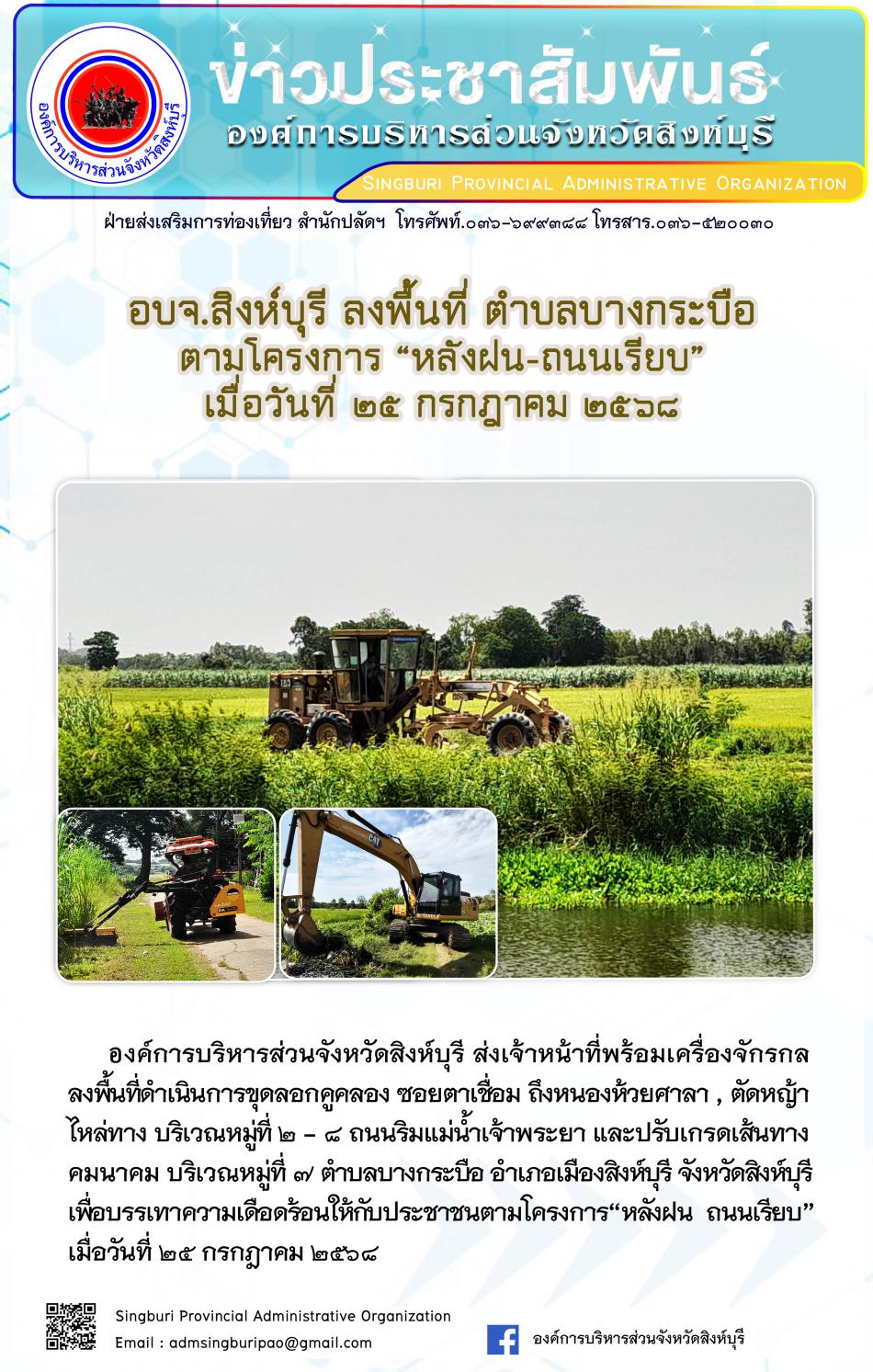 อบจ.สิงห์บุรี ลงพื้นที่ ตำบลบางกระบือ ตามโครงการ "หลังฝน - ถนนเรียบ" [25 กรกฎาคม 2568]