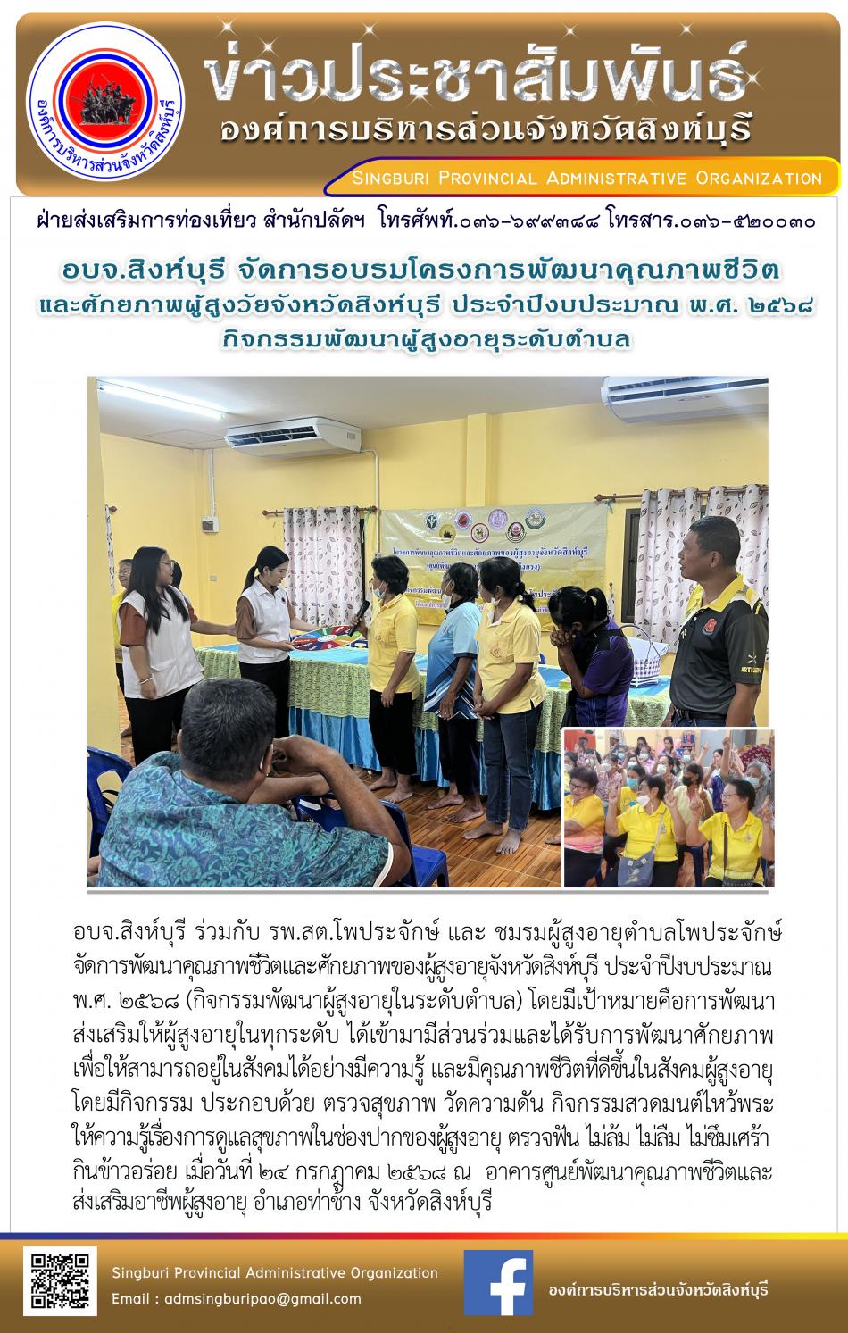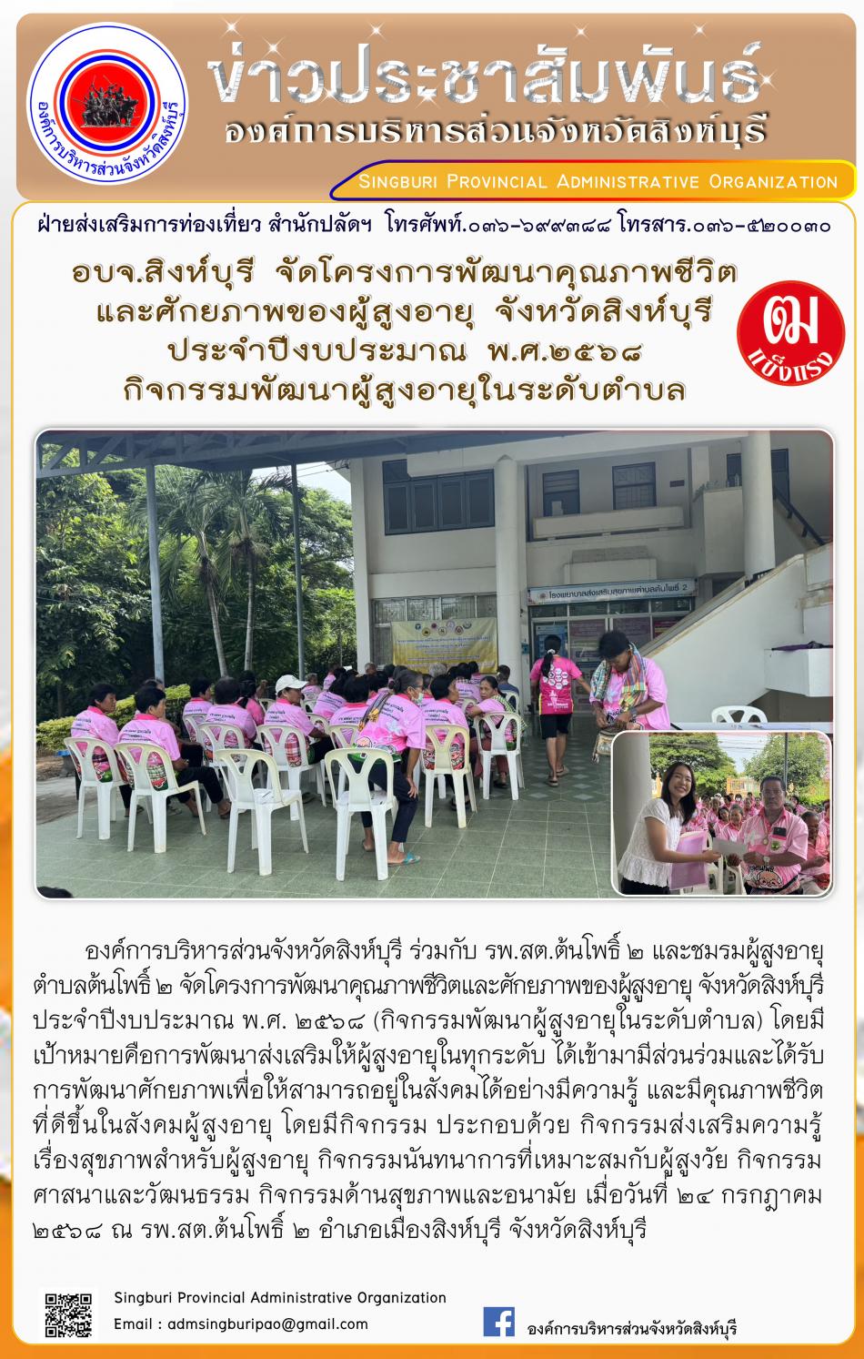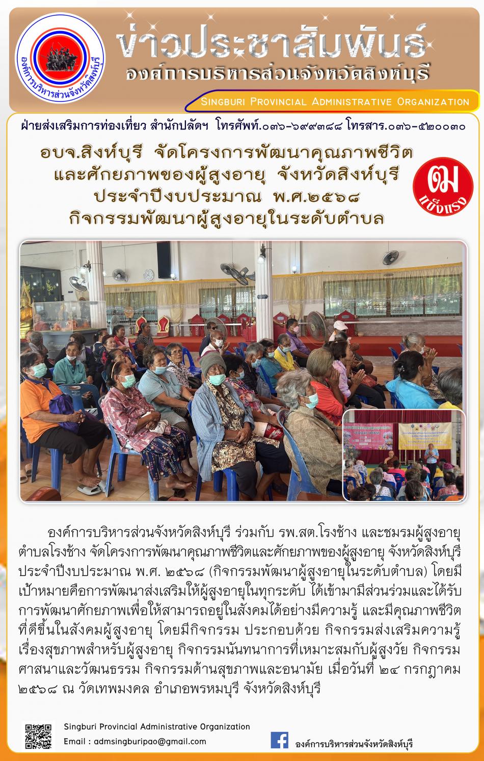 อบจ.สิงห์บุรี จัดโครงการพัฒนาคุณภาพชีวิตและศักยภาพผุ้สูงอายุจังหวัดสิงห์บุรี ประจำปีงบประมาณพ.ศ.2568 กิจกรรมพัฒนาผู้สูงอายุในระดับตำบล [24 กรกฎาคม 2568]