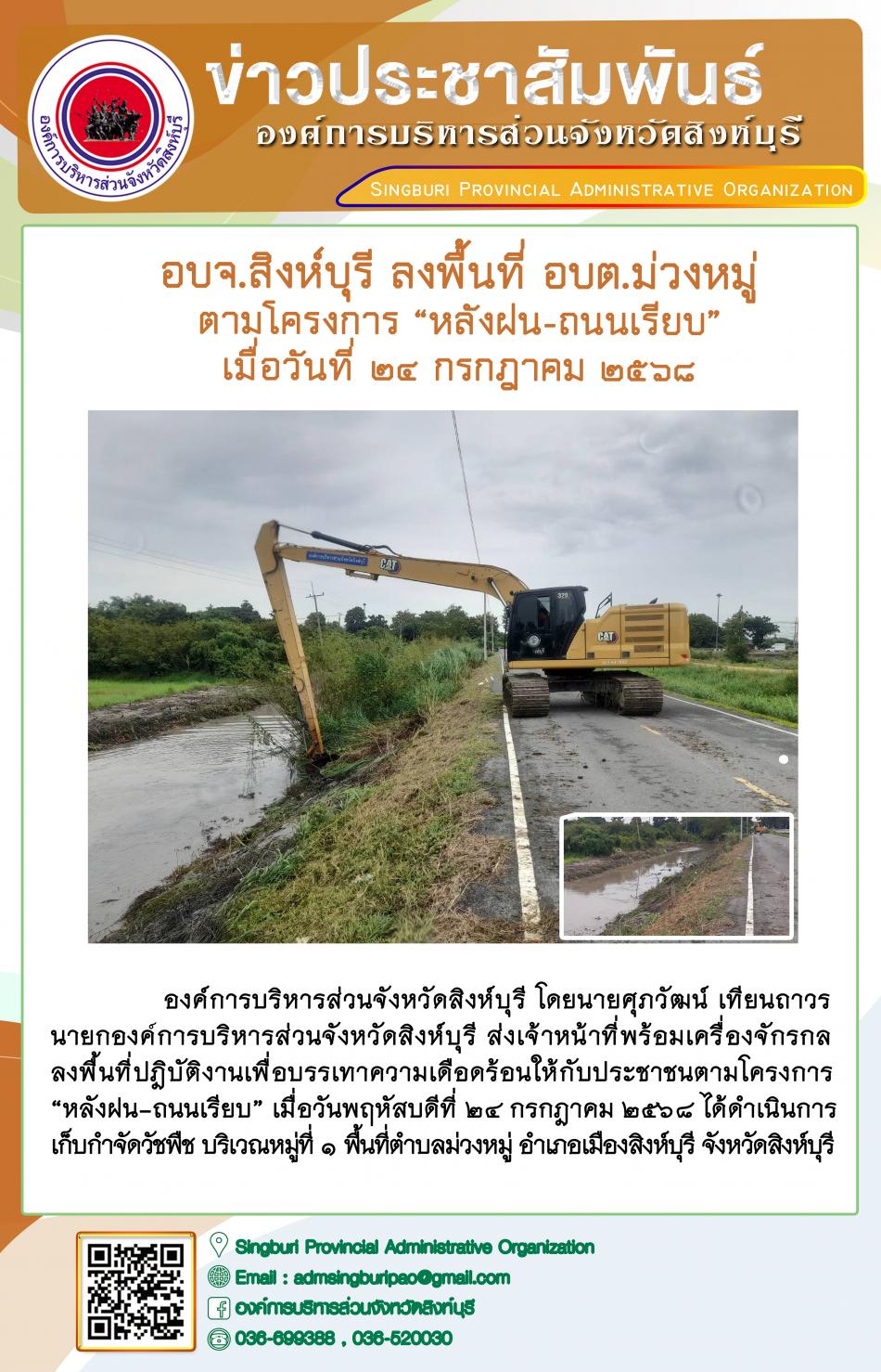 อบจ.สิงห์บุรี ลงพื้นที่ อบต.ม่วงหมู่ ตามโครงการ "หลังฝน - ถนนเรียบ" [24 กรกฎาคม 2568]
