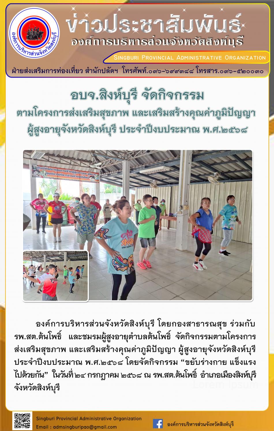 อบจ.สิงห์บุรี จัดกิจกรรมตามโครงการส่งเสริมสุขภาพ และเสริมสร้างคุณค่าภูมิปัญญาผู้สูงอายุจังหวัดสิงห์บุรี ประจำปีงบประมาณ พ.ศ.2568 [24 กรกฎาคม 2568]