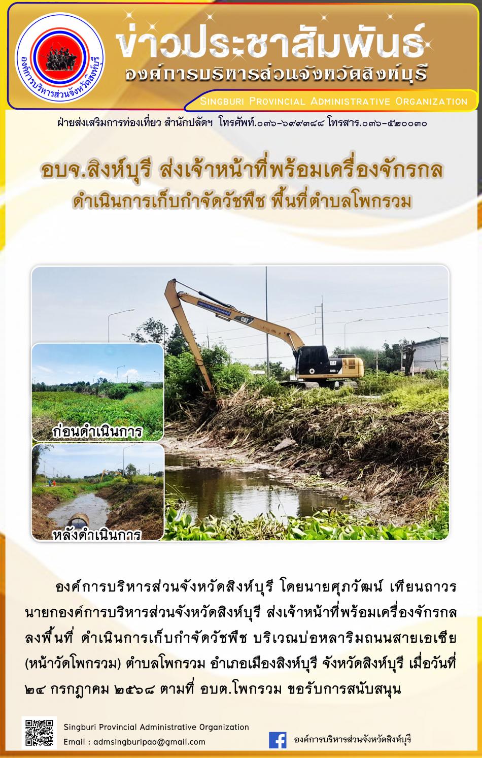 อบจ.สิงห์บุรี ส่งเจ้าหน้าที่พร้อมเครื่องจักรกล เก็บกำจัดวัชพืช พื้นที่ตำบลโพกรวม [24 กรกฎาคม 2568]