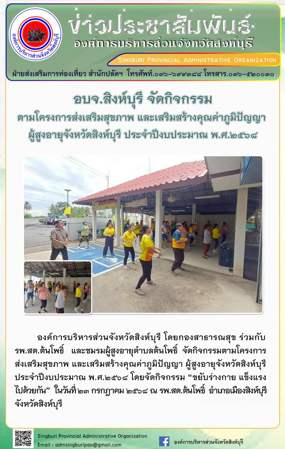 อบจ.สิงห์บุรี จัดกิจกรรมตามโครงการส่งเสริมสุขภาพ และเสริมสร้างคุณค่าภูมิปัญญาผู้สูงอายุจังหวัดสิงห์บุรี ประจำปีงบประมาณ พ.ศ.2568 [23 กรกฎาคม 2568]