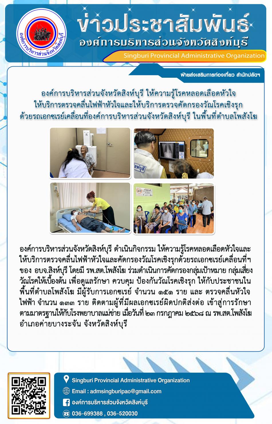 องค์การบริหารส่วนจังหวัดสิงห์บุรี ให้ความรู้โรคหลอดเลือดหัวใจและให้บริการตรวจคัดกรองวัณโรคเชิงรุกด้วยรถเอกซเรย์เคลื่อนที่องค์การบริหารส่วนจังหวัดสิงห์บุรี ในพื้นที่ตำบลโพสังโฆ [23 กรกฎาคม 2568]