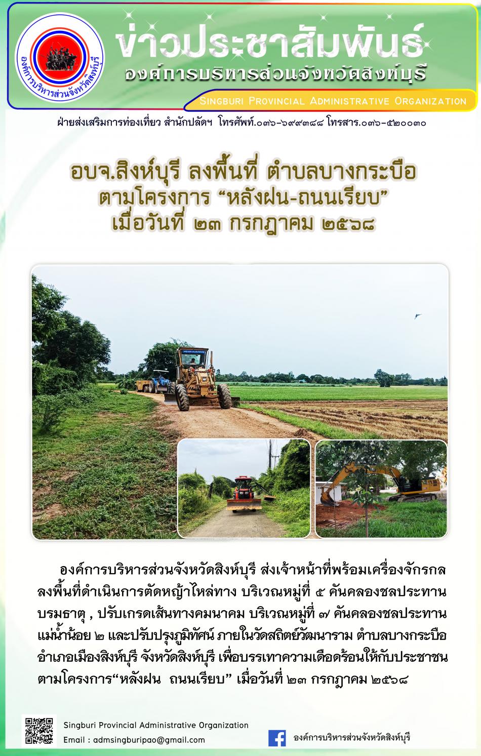 อบจ.สิงห์บุรี ลงพื้นที่ ตำบลบางกระบือ ตามโครงการ "หลังฝน - ถนนเรียบ" [23 กรกฎาคม 2568]