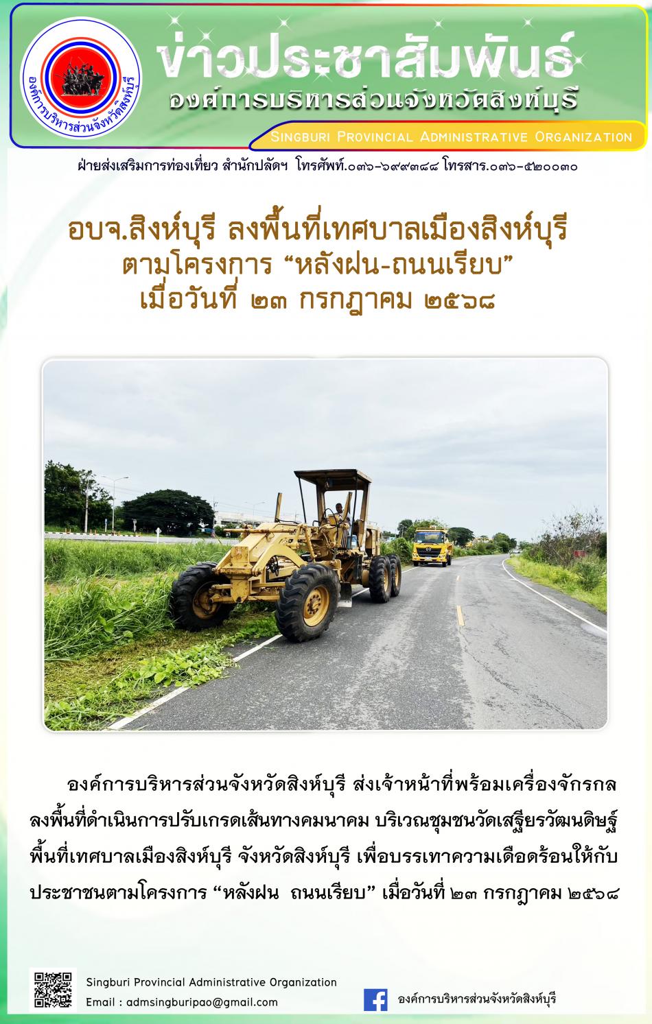 อบจ.สิงห์บุรี ลงพื้นที่ เทศบาลเมืองสิงห์บุรี ตามโครงการ "หลังฝน - ถนนเรียบ" [23 กรกฎาคม 2568]