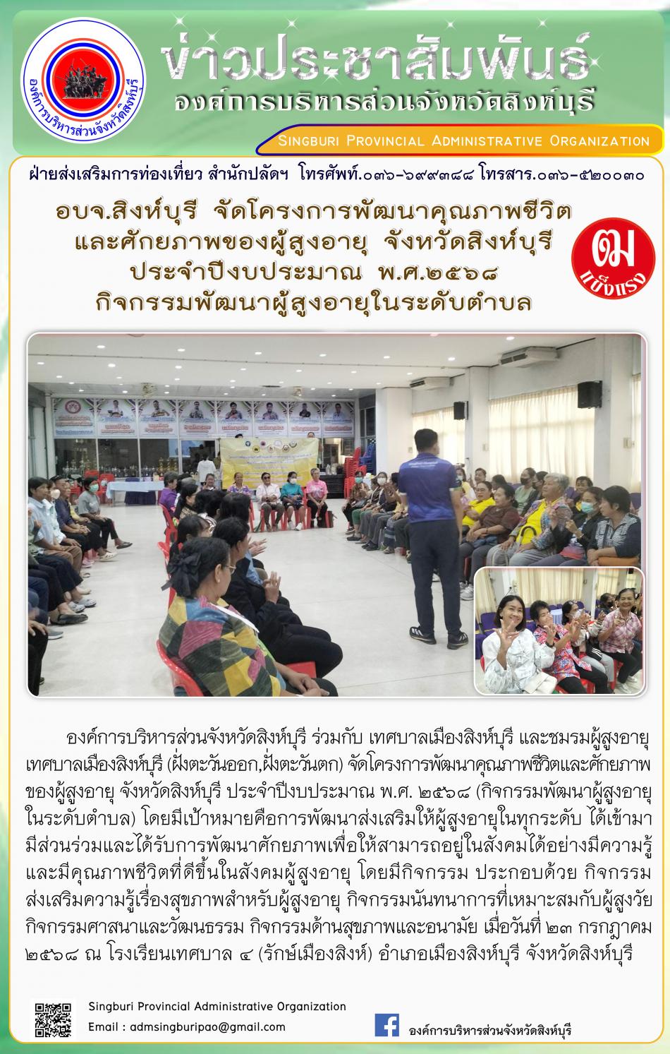 อบจ.สิงห์บุรี จัดโครงการพัฒนาคุณภาพชีวิตและศักยภาพผุ้สูงอายุจังหวัดสิงห์บุรี ประจำปีงบประมาณพ.ศ.2568 กิจกรรมพัฒนาผู้สูงอายุในระดับตำบล [23 กรกฎาคม 2568]