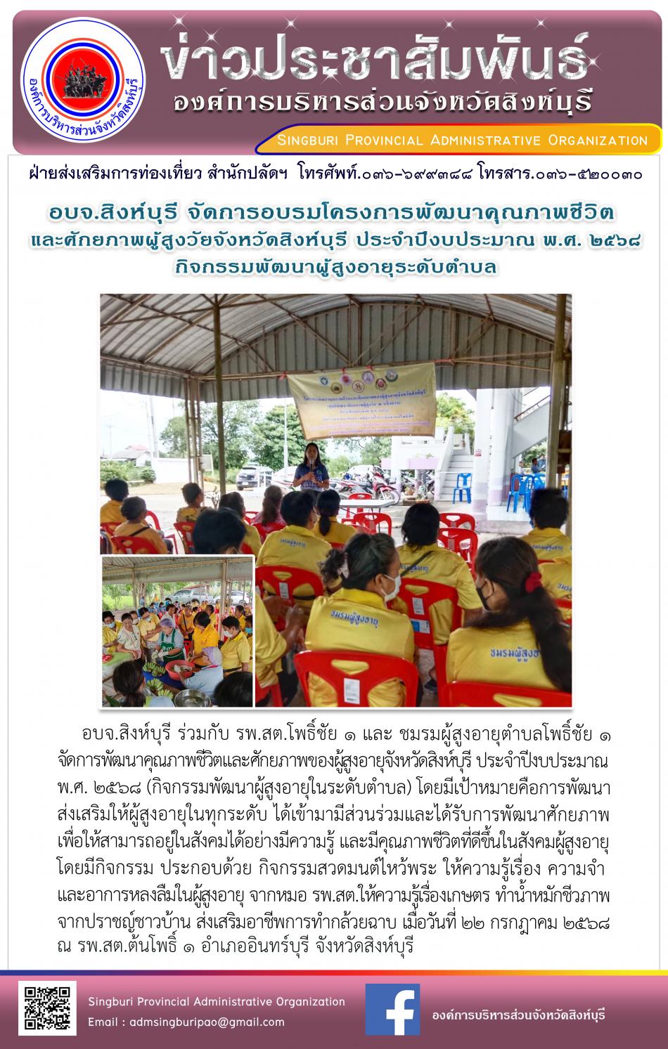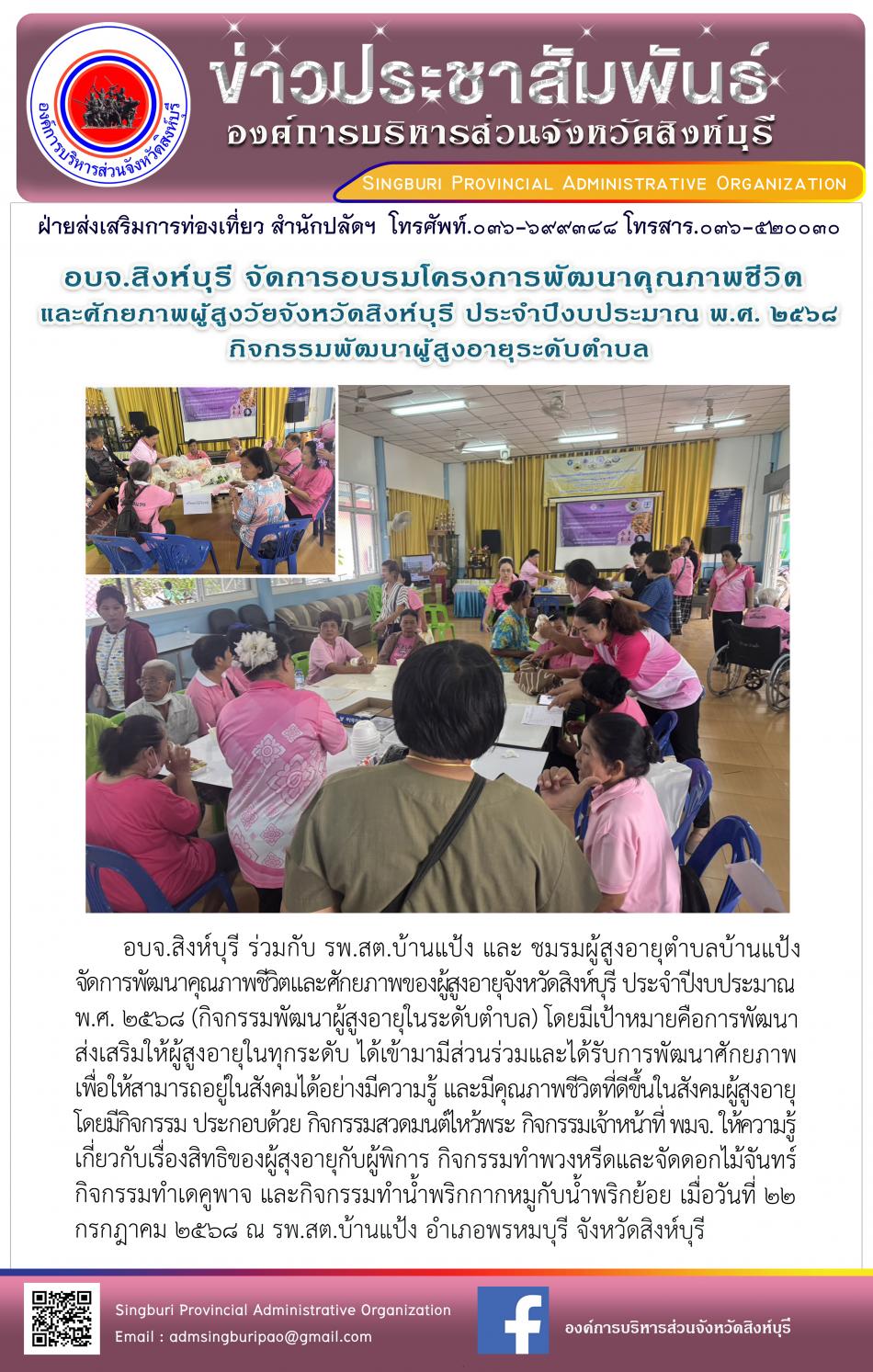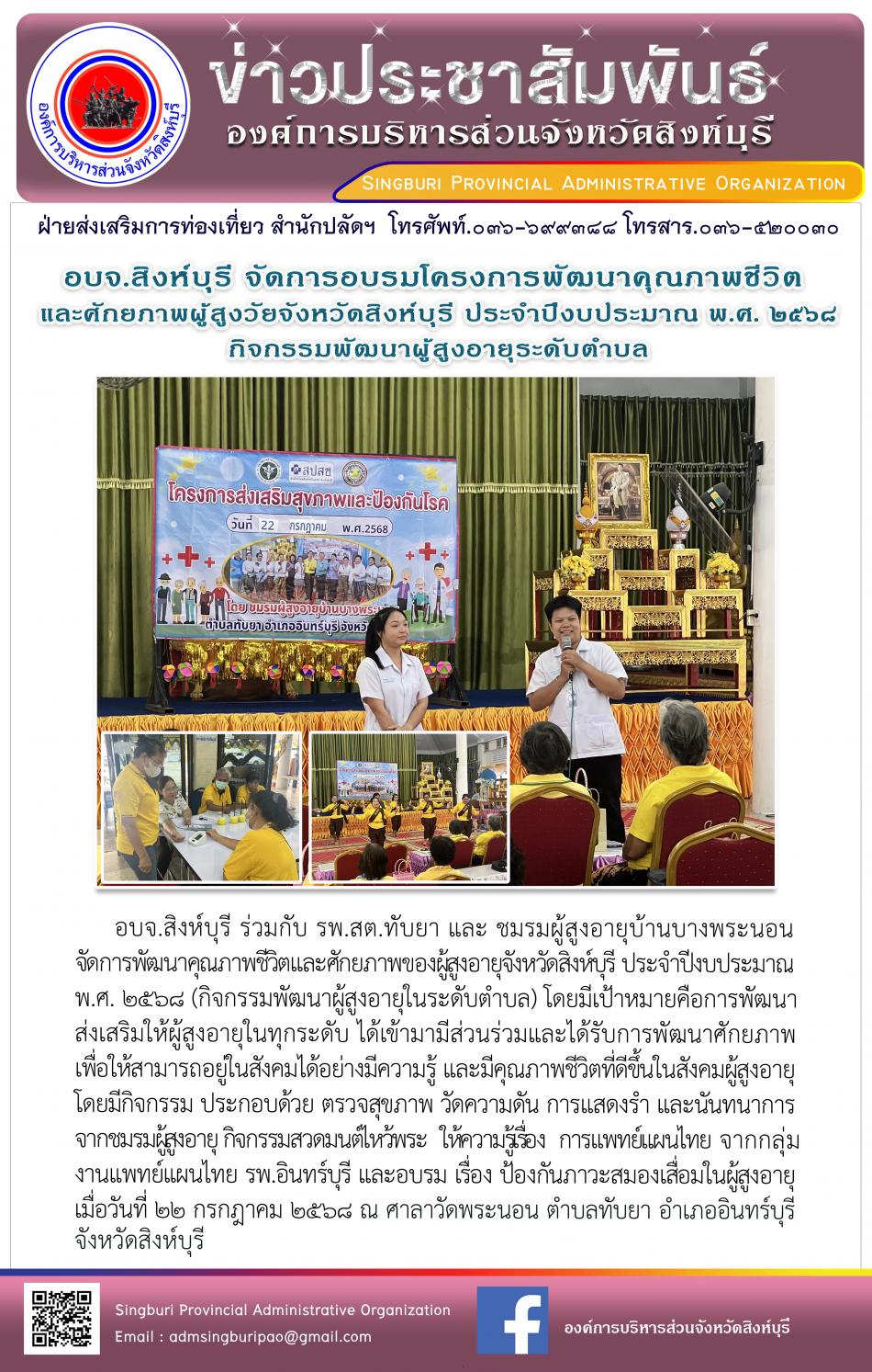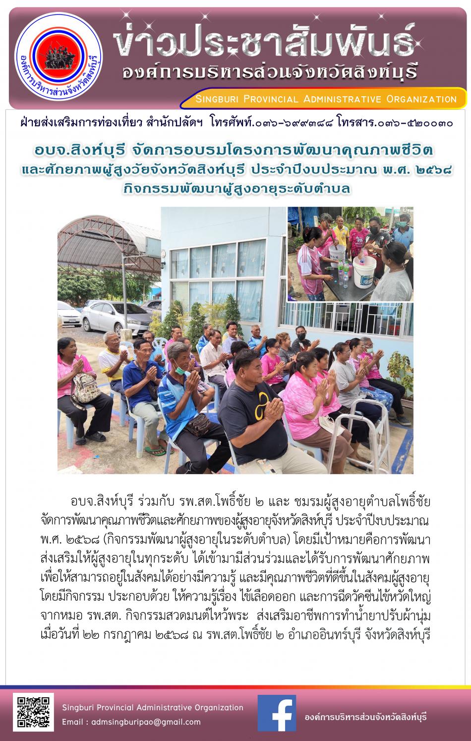 อบจ.สิงห์บุรี จัดโครงการพัฒนาคุณภาพชีวิตและศักยภาพผุ้สูงอายุจังหวัดสิงห์บุรี ประจำปีงบประมาณพ.ศ.2568 กิจกรรมพัฒนาผู้สูงอายุในระดับตำบล [22 กรกฎาคม 2568]