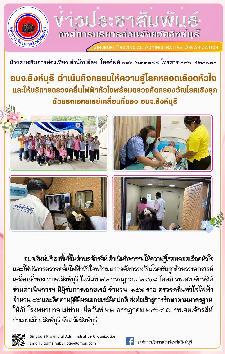 อบจ.สิงห์บุรี ดำเนินกิจกรรมให้ความรู้โรคหลอดเลือดหัวใจและให้บริการตรวจคลื่นไฟฟ้าหัวใจพร้อมตรวจคัดกรองวัณโรคเชิงรุกด้วยรถเอกซเรย์เคลื่อนที่ของ อบจ.สิงห์บุรี [22 กรกฎาคม 2568]