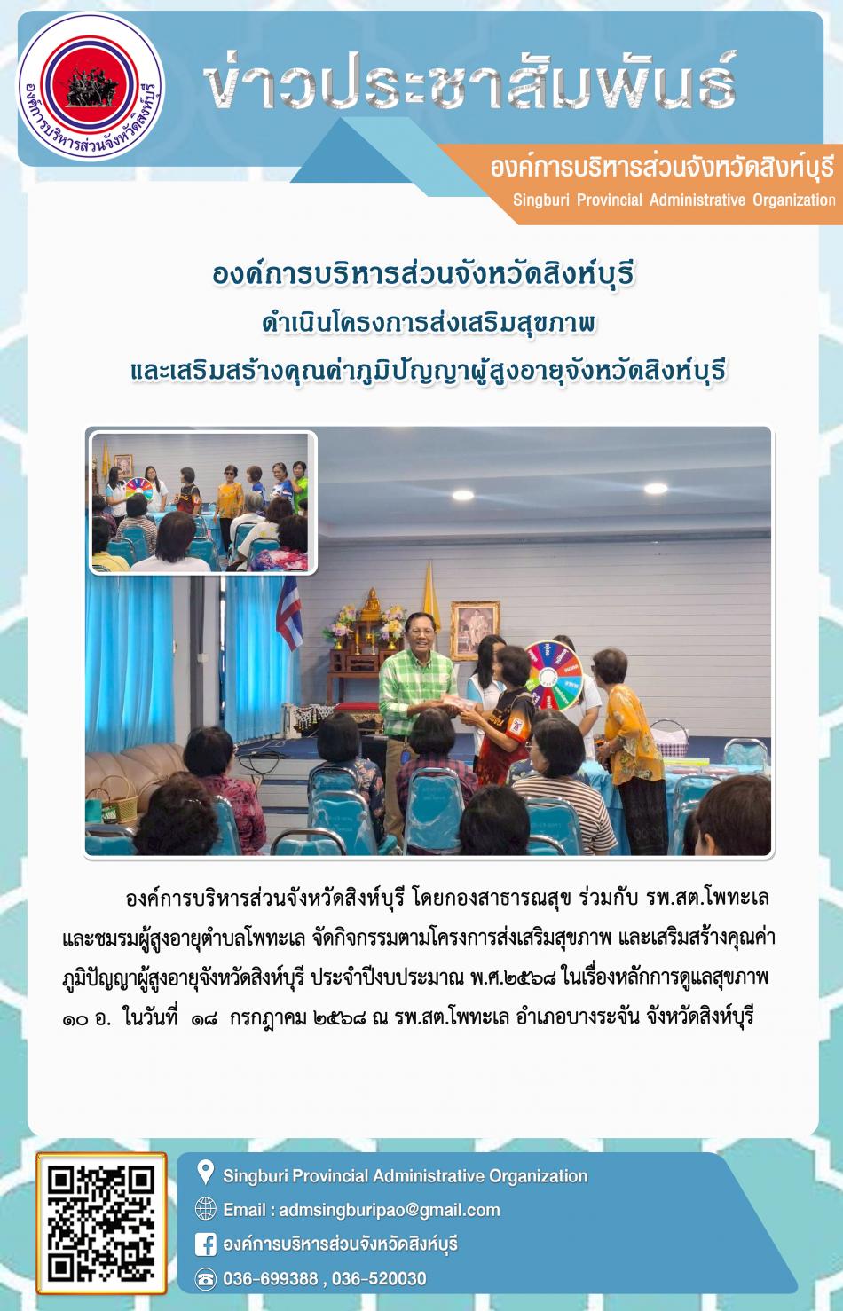 องค์การบริหารส่วนจังหวัดสิงห์บุรี ดำเนินโครงการส่งเสริมสุขภาพและเสริมสร้างคุณค่าภูมิปัญญาผู้สูงอายุจังหวัดสิงห์บุรี [18 กรกฎาคม 2568]