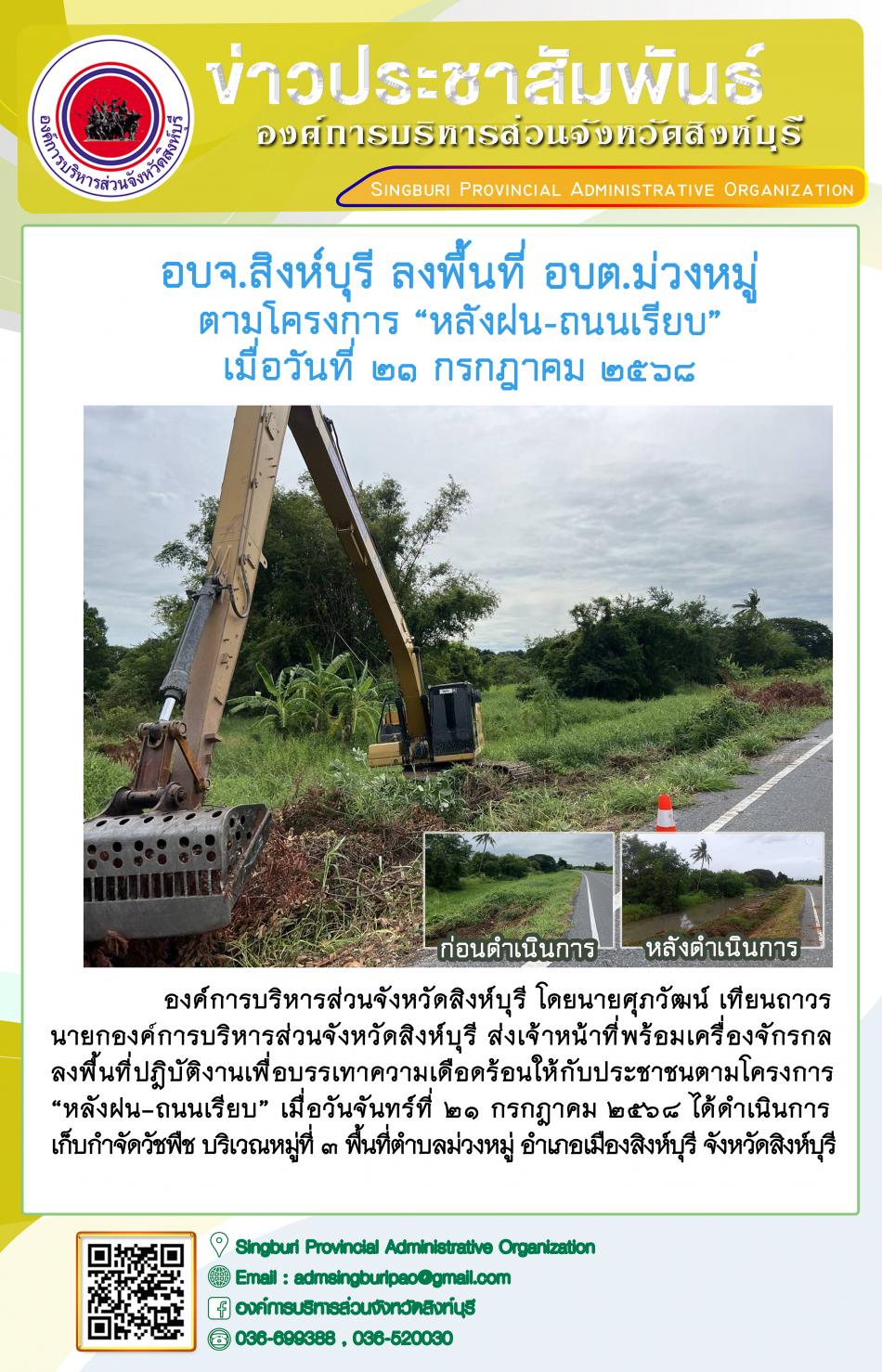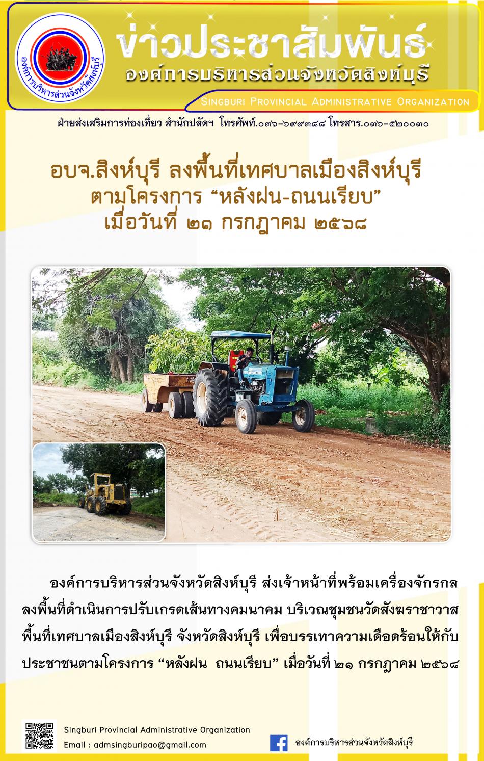 อบจ.สิงห์บุรี ลงพื้นที่ อบต.ม่วงหมู่ ตามโครงการ "หลังฝน - ถนนเรียบ" [21 กรกฎาคม 2568]