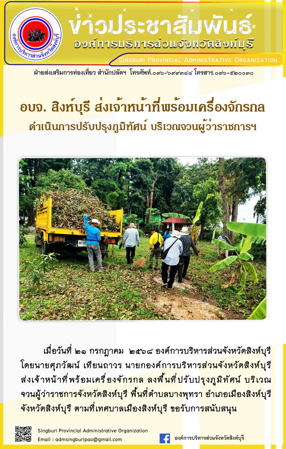 อบจ.สิงห์บุรี ส่งเจ้าหน้าที่พร้อมเครื่องจักรกล ดำเนินการปรับปรุงภูมิทัศน์ บริเวณจวนผู้ว่าราชการฯ [21 กรกฎาคม 2568]