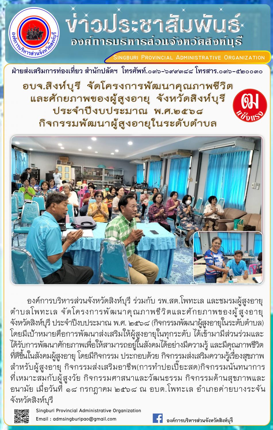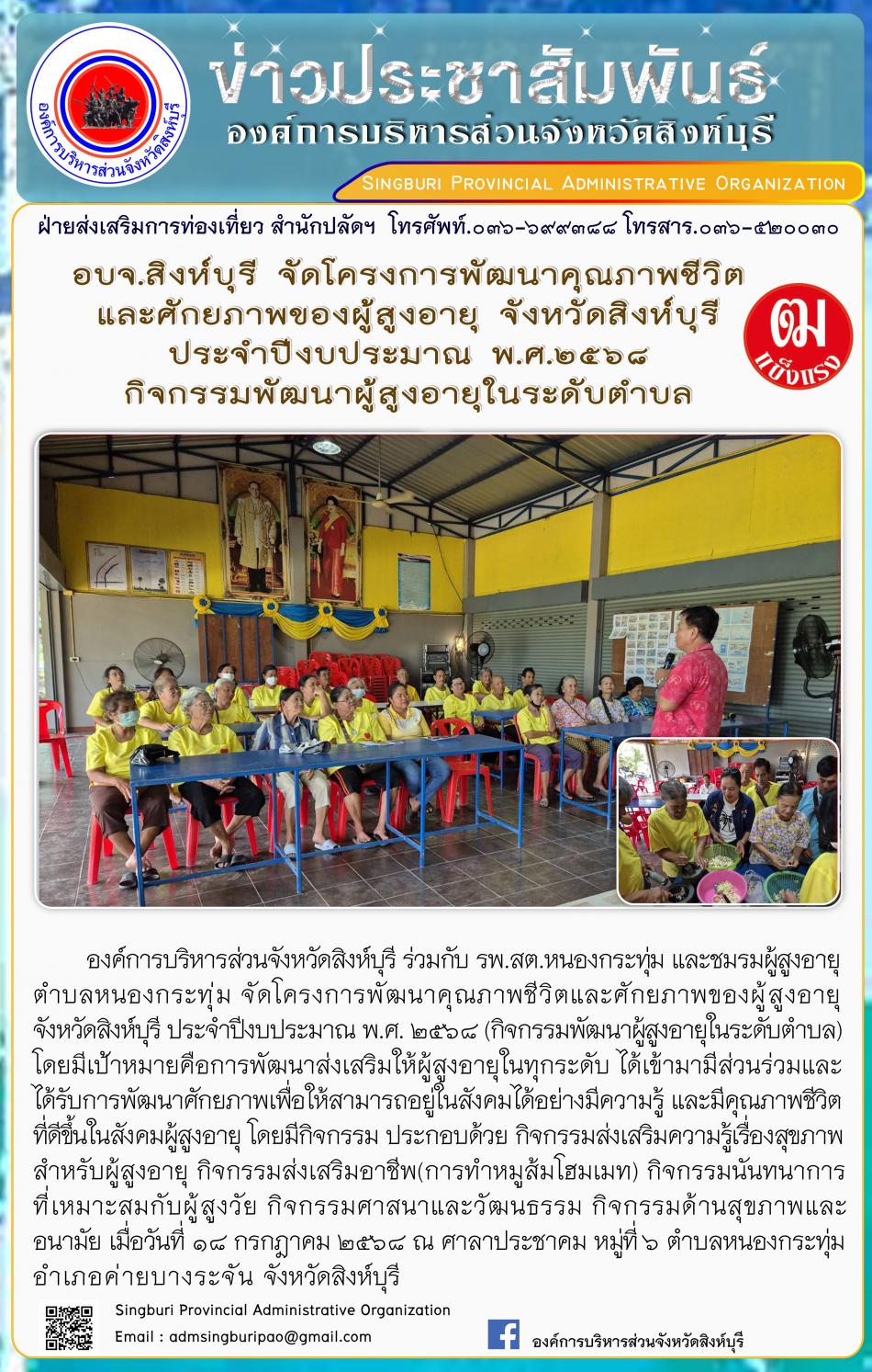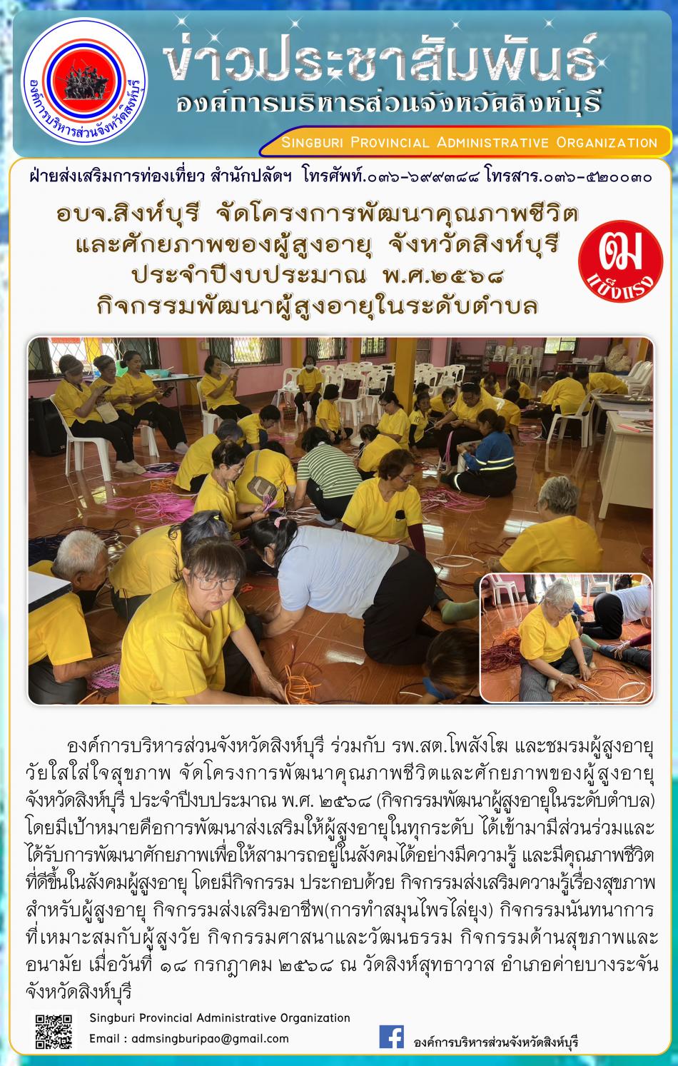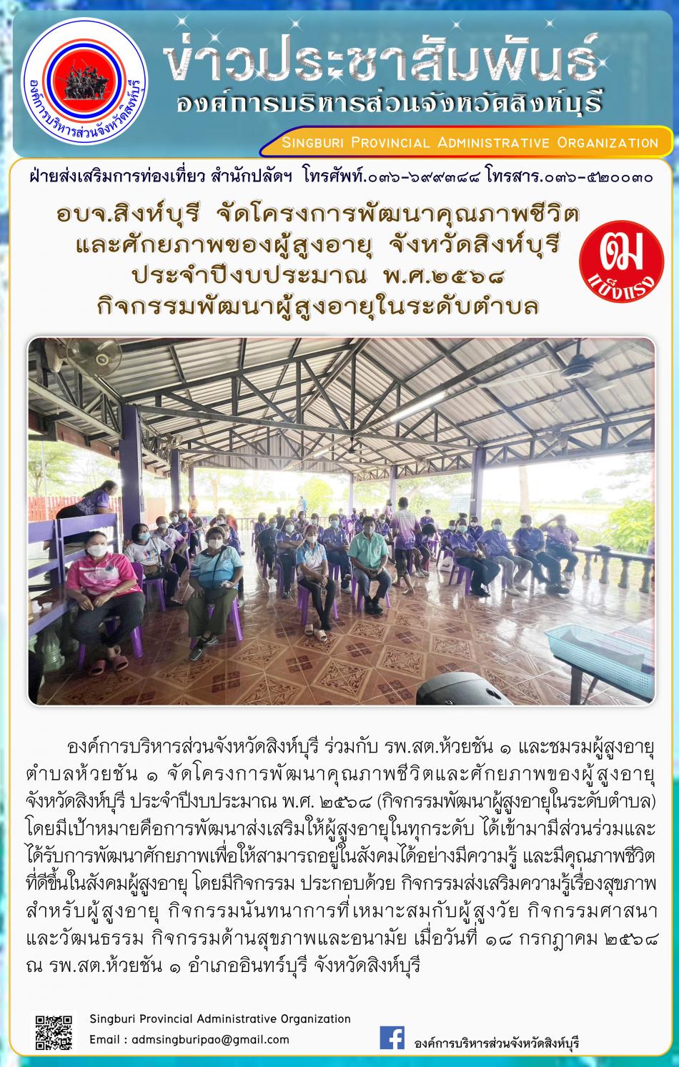 อบจ.สิงห์บุรี จัดโครงการพัฒนาคุณภาพชีวิตและศักยภาพผุ้สูงอายุจังหวัดสิงห์บุรี ประจำปีงบประมาณพ.ศ.2568 กิจกรรมพัฒนาผู้สูงอายุในระดับตำบล [18 กรกฎาคม 2568]
