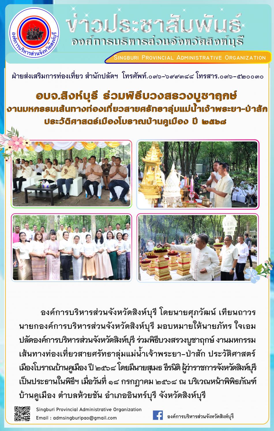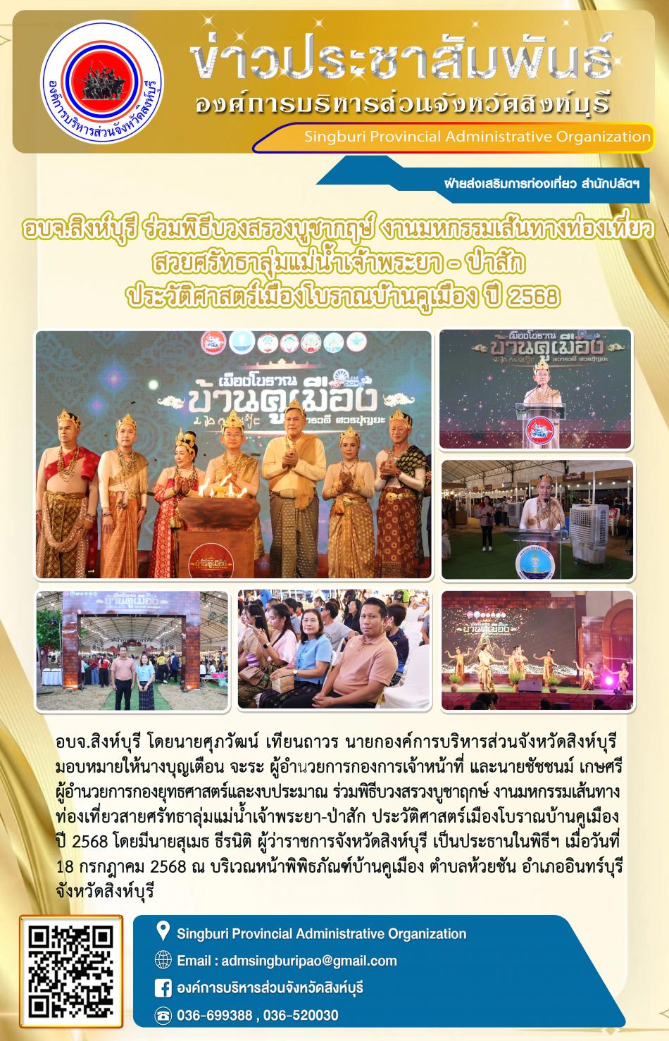 อบจ.สิงห์บุรี ร่วมพิธีบวงสรวงบูชากฤษ์ งานมหกรรมเส้นทางท่องเที่ยว สวยศรัทธาลุ่มแม่น้ำเจ้าพระยา - ป่าสัก ประวัติศาสตร์เมืองโบราณบ้านคูเมือง ปี 2568 [18 กรกฎาคม 2568]