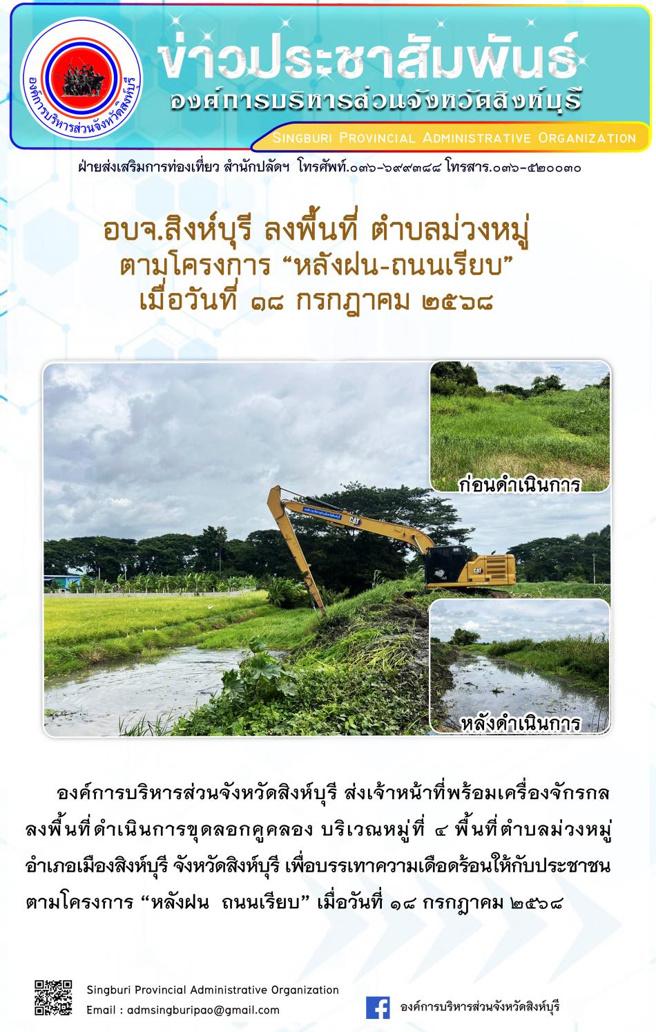 อบจ.สิงห์บุรี ลงพื้นที่ ตำบลม่วงหมู่ ตามโครงการ "หลังฝน - ถนนเรียบ" [18 กรกฎาคม 2568]