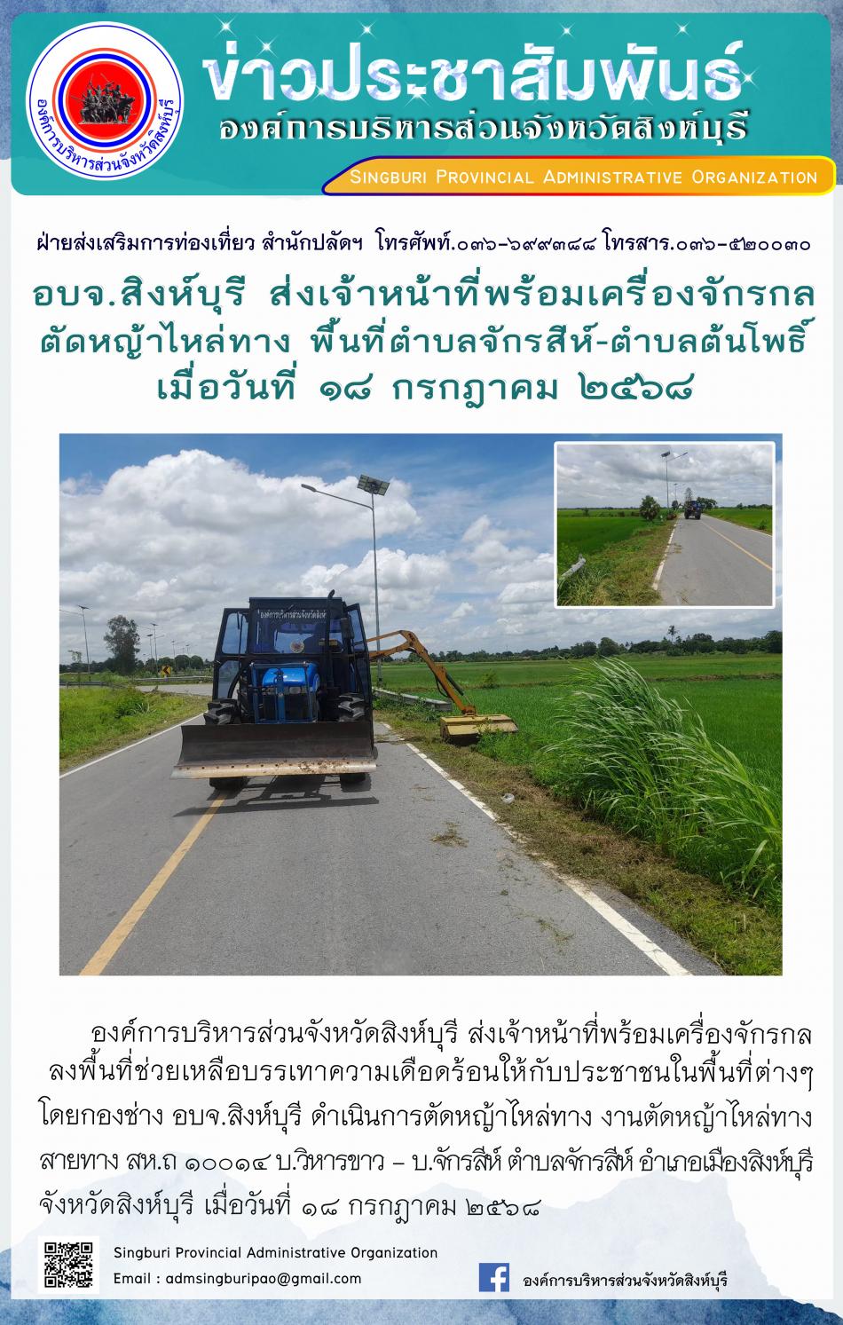 อบจ.สิงห์บุรี ส่งเจ้าหน้าที่พร้อมเครื่องจักรกล ตัดหญ้าไหล่ทาง พื้นที่ตำบลจักรสีห์ - ตำบลต้นโพธิ์ [18 กรกฎาคม 2568]