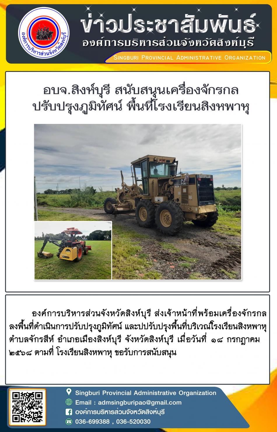 อบจ.สิงห์บุรี ส่งเจ้าหน้าที่พร้อมเครื่องจักรกล ปรับปรุงภูมิทัศน์ พื้นที่โรงเรียนสิงหพาหุ [18 กรกฎาคม 2568]
