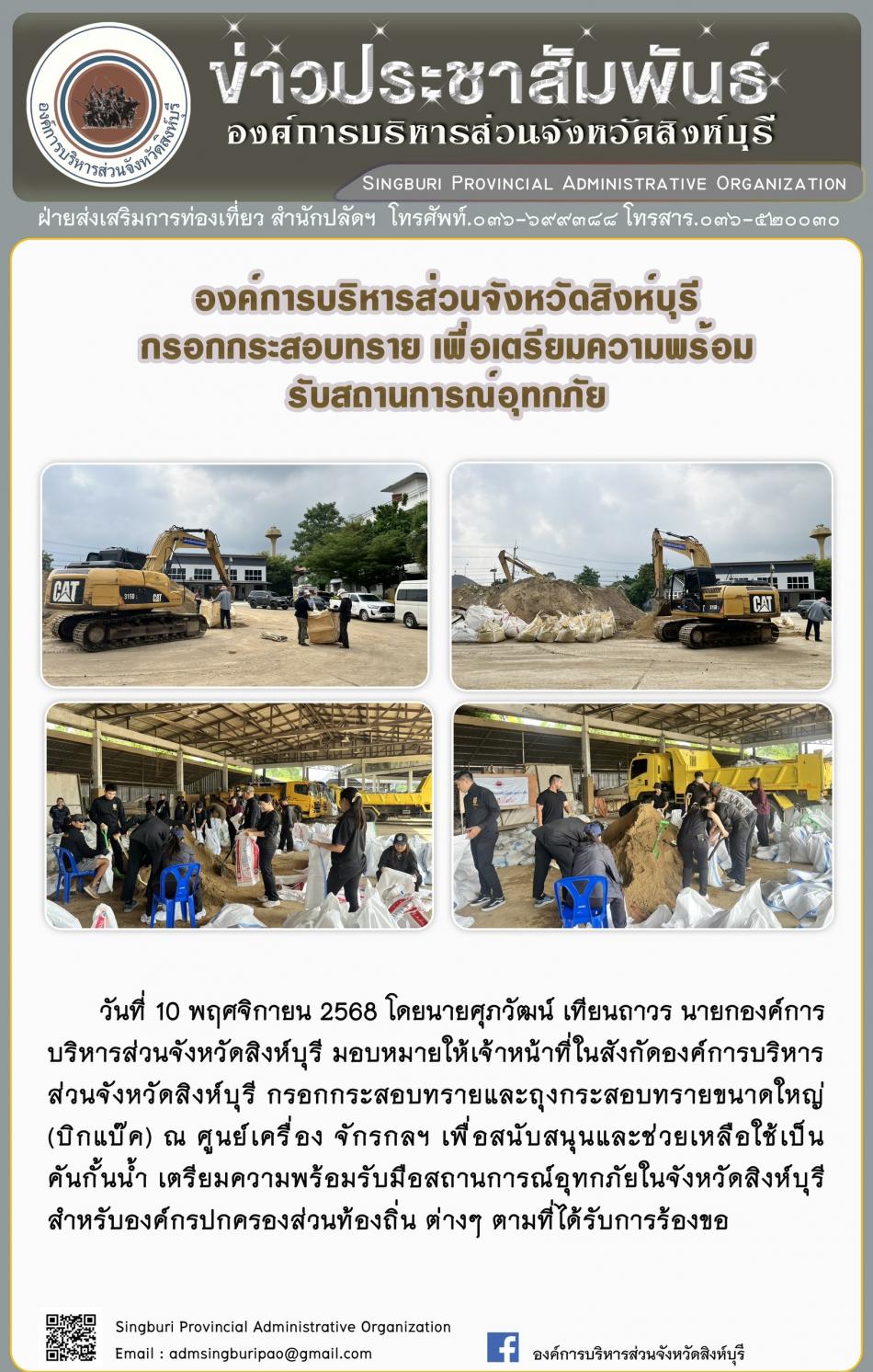 องค์การบริหารส่วนจังหวัดสิงห์บุรี กรอกกระสอบทราย เดื่อเตรียมความพร้อม รับสถานการณ์อุทกภัย [10 พฤศจิกายน 2568]