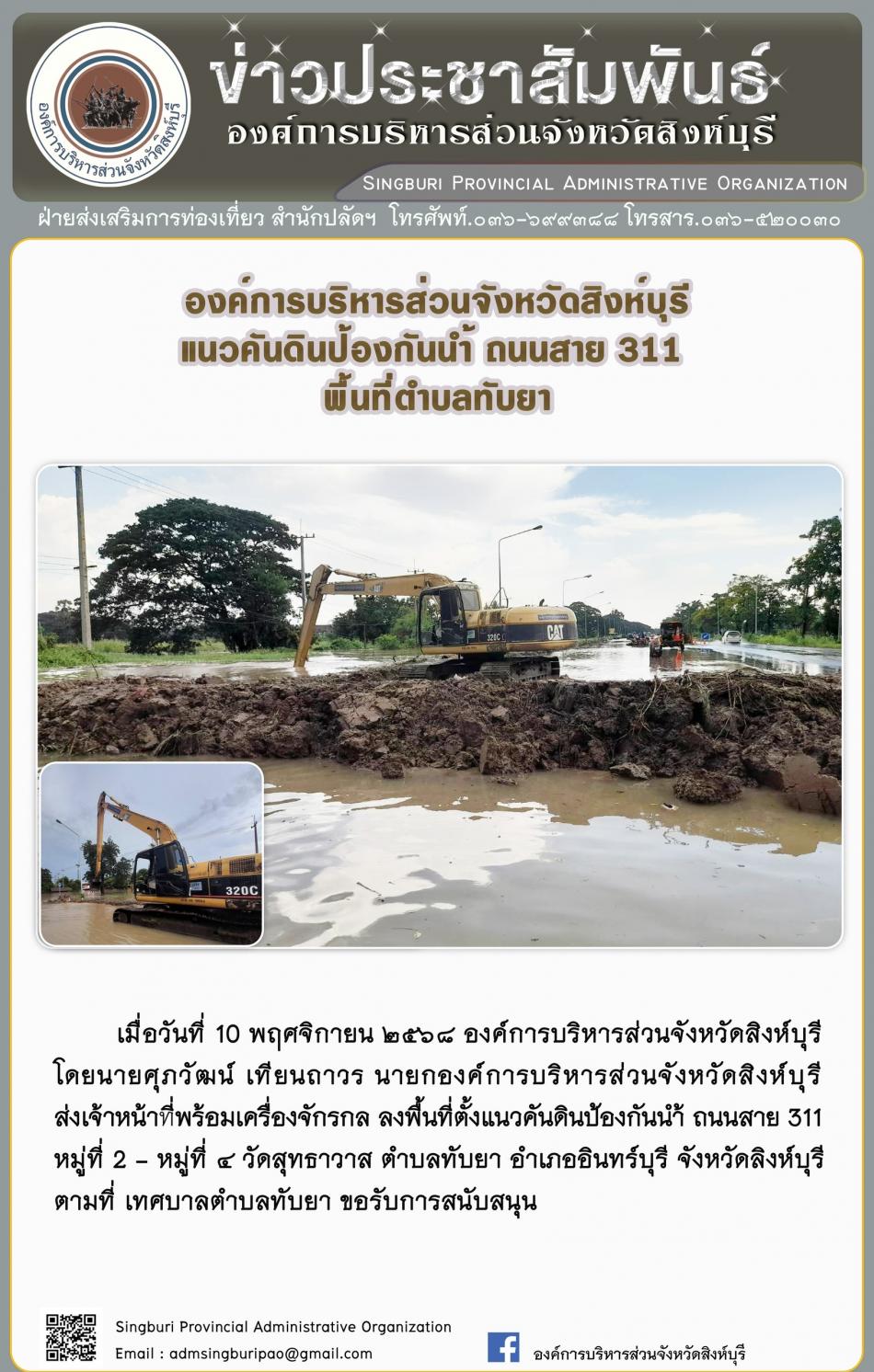 องค์การบริหารส่วนจังหวัดสิงห์บุรี สร้างแนวคันดินป้องกันน้ำ ถนนสาย 311 พื้นที่ตำบลทับยา [10 พฤศจิกายน 2568]