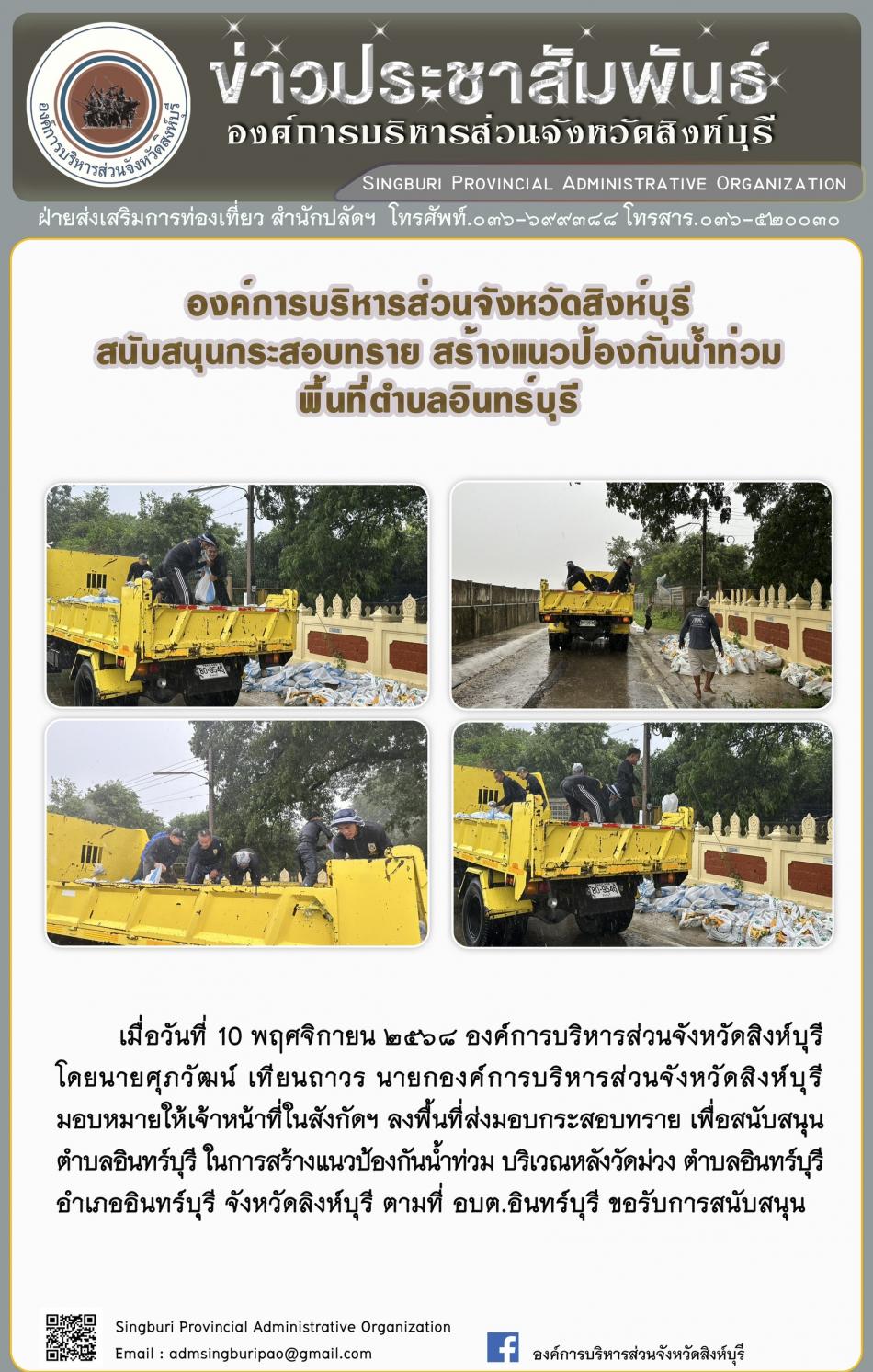 องค์การบริหารส่วนจังหวัดสิงห์บุรี สนับสนุนกระสอบทราย สร้างแนวป้องกันน้ำท่วม พื้นที่ตำบลอินทร์บุรี [10 พฤศจิกายน 2568]