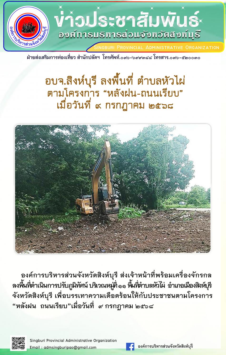 อบจ.สิงห์บุรี ลงพื้นที่ ตำบลหัวไผ่ ตามโครงการ "หลังฝน - ถนนเรียบ" [9 กรกฎาคม 2568]