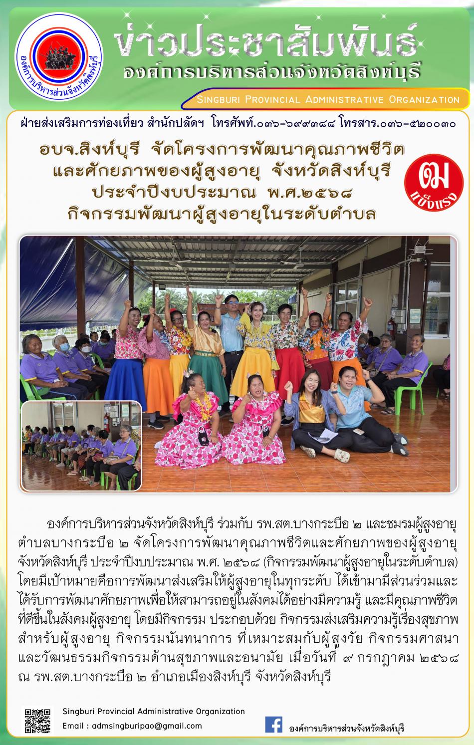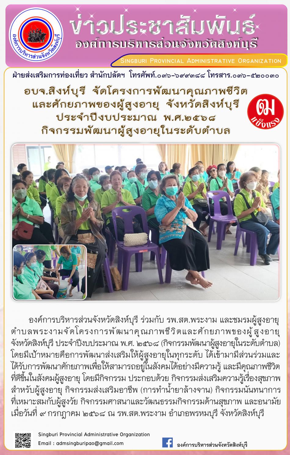 อบจ.สิงห์บุรี จัดโครงการพัฒนาคุณภาพชีวิตและศักยภาพผุ้สูงอายุจังหวัดสิงห์บุรี ประจำปีงบประมาณพ.ศ.2568 กิจกรรมพัฒนาผู้สูงอายุในระดับตำบล [9 กรกฎาคม 2568]