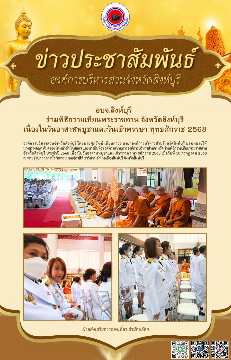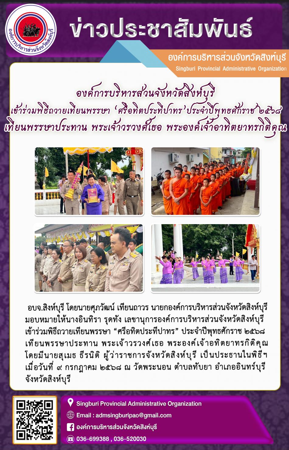 องค์การบริหารส่วนจังหวัดสิงห์บุรี เข้าร่วมพิธีถวายเที่ยนพรรษา "ศรีอทิตประทีปาทร"ประจำปีพุทธศักราช 2568 เทียนพรรษาประทาน พระเจ้าวรวงศ์เธอ พระองค์เจ้าอาทิตยาทรกิติคุณ [9 กรกฎาคม 2568]