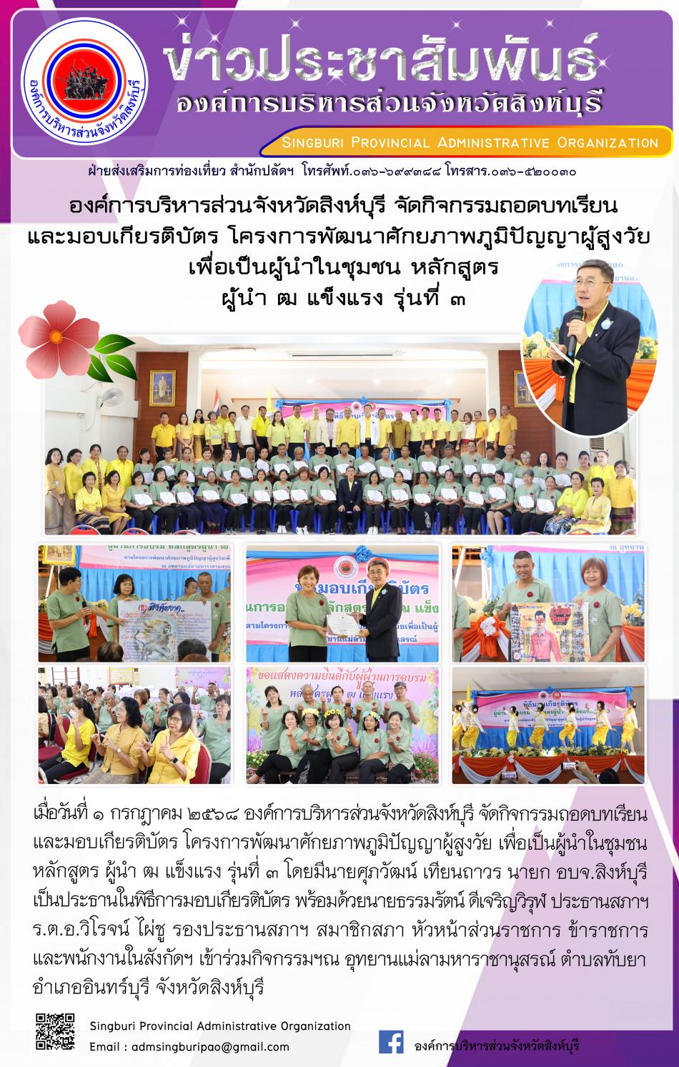 องค์การบริหารส่วนจังหวัดสิงห์บุรี จัดกิจกรรมถอดบทเรียนและมอบเกียรติบัติ โครงการพัฒนาศักยภาพภูมิปัญญาผู้สูงวัย เพื่อเป็นผู้นำชุมชน หลักสูตร ผู้นำ ฒ แข็งแรง รุนที่ 3 [1 กรกฎาคม 2568]