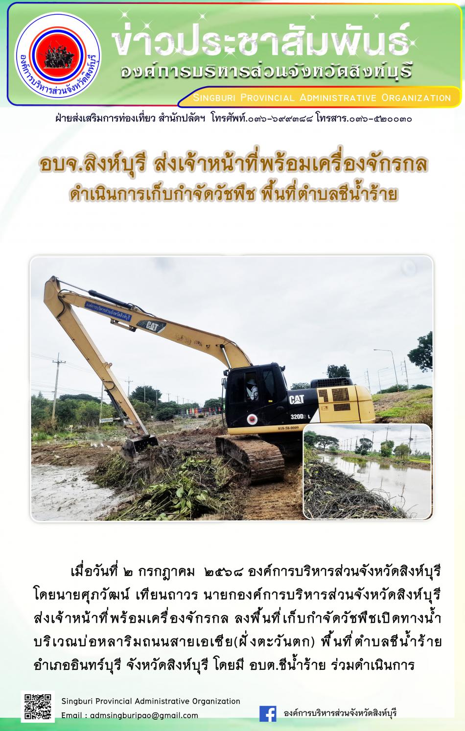 อบจ.สิงห์บุรี ส่งเจ้าหน้าที่พร้อมเครื่องจักรกล เก็บกำจัดวัชพืช พื้นที่ตำบลชีน้ำร้าย [2 กรกฎาคม 2568]