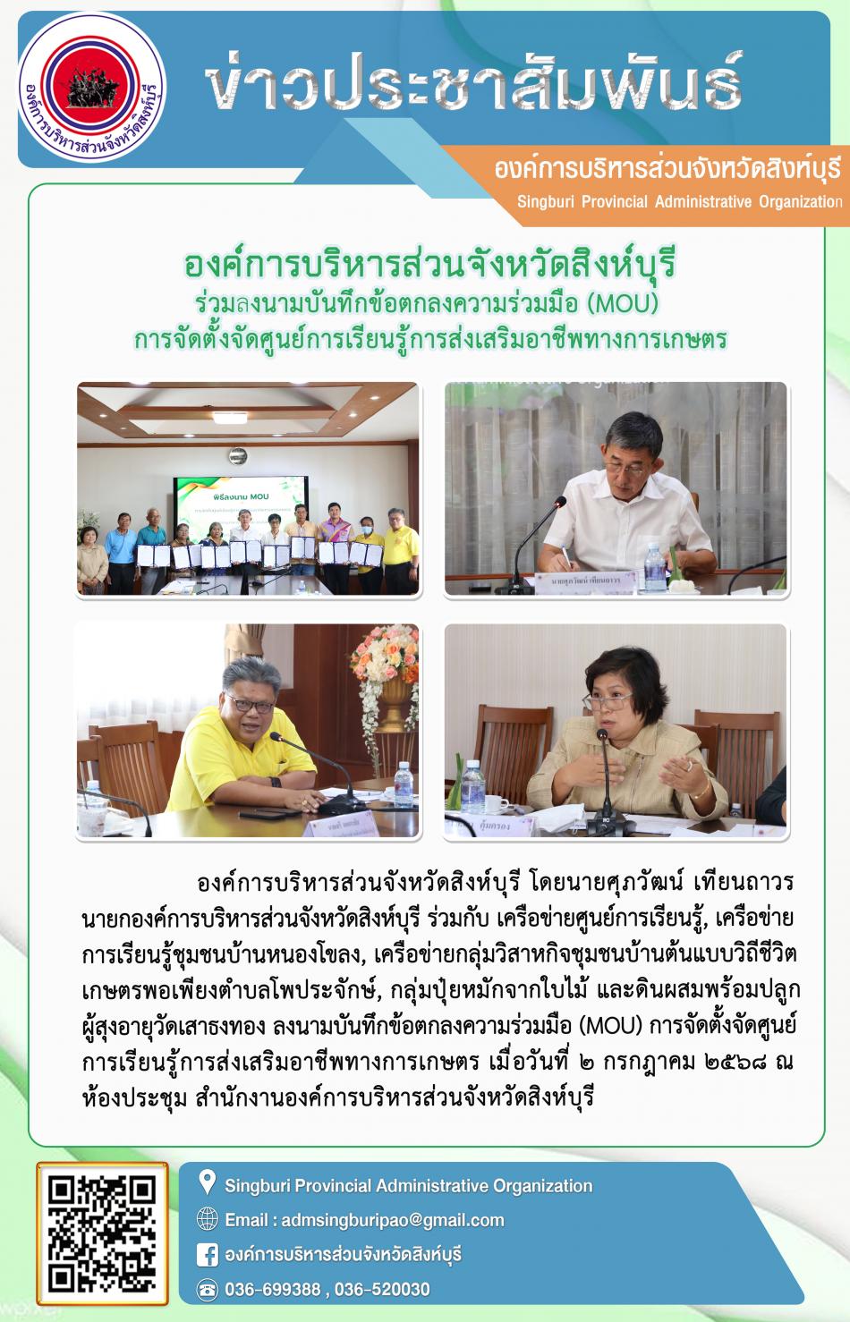 องค์การบริหารส่วนจังหวัดสิงห์บุรี ร่วมลงนามบันทึกข้อตกลงความร่วมมือ (MOU) การจัดตั้งศูนย์การเรียนรู้การส่วเสริมอาชีพทางการเกษตร [2 กรกฎาคม 2568]