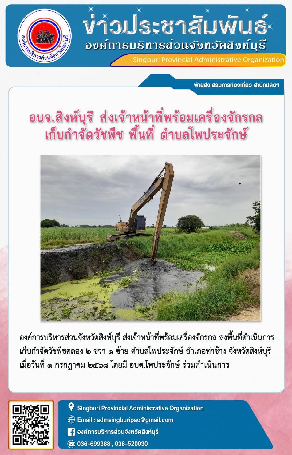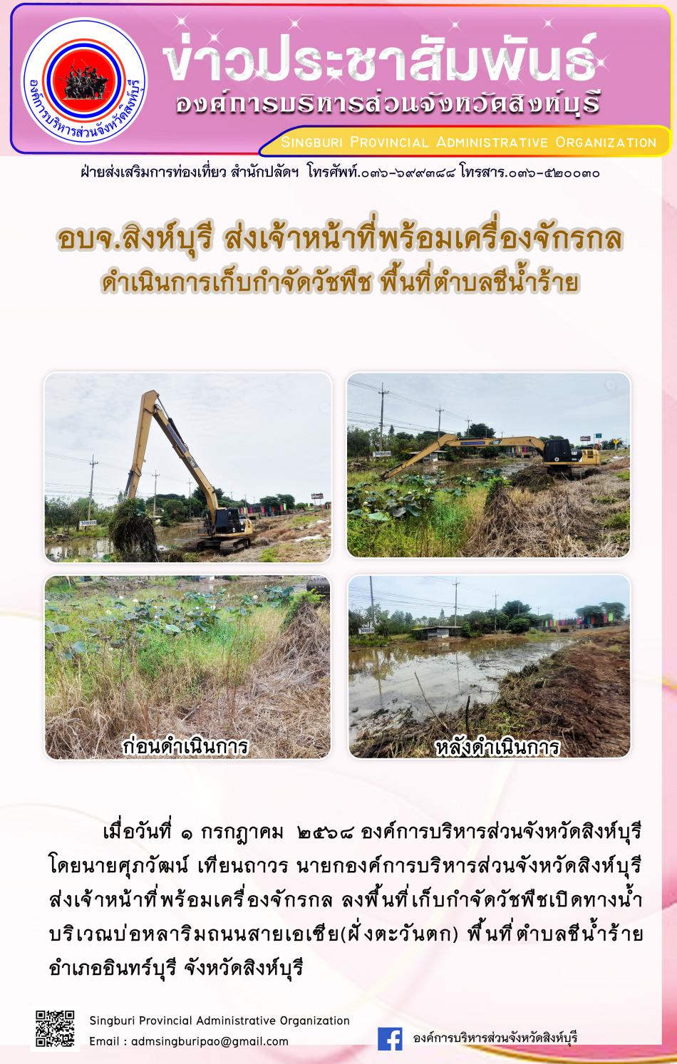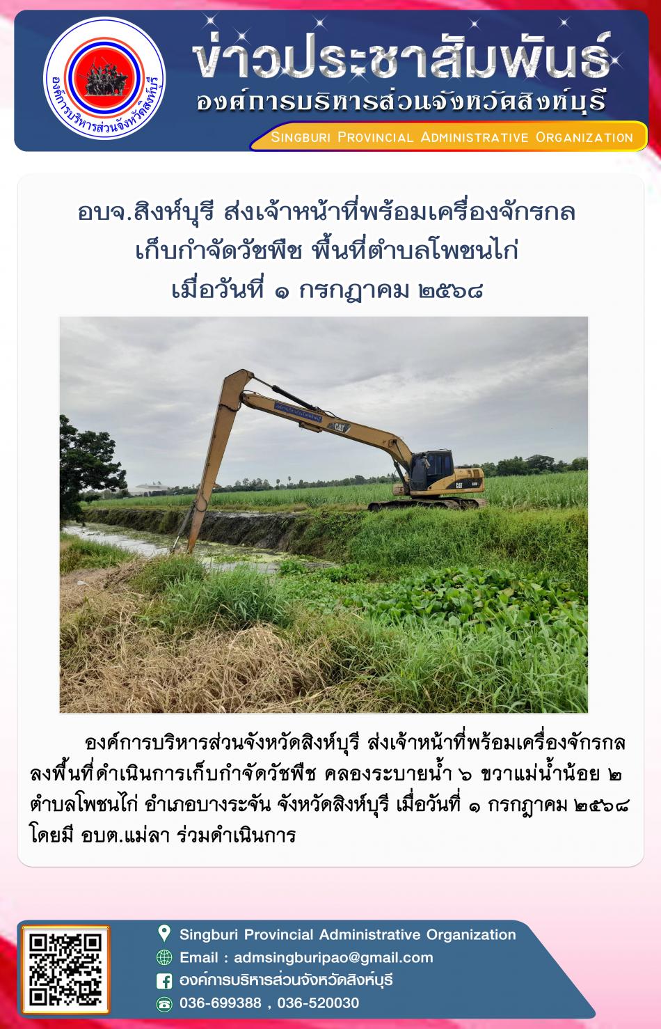 อบจ.สิงห์บุรี ส่งเจ้าหน้าที่พร้อมเครื่องจักรกล เก็บกำจัดวัชพืช พื้นที่ตำบลโพชนไก่ [1 กรกฎาคม 2568]