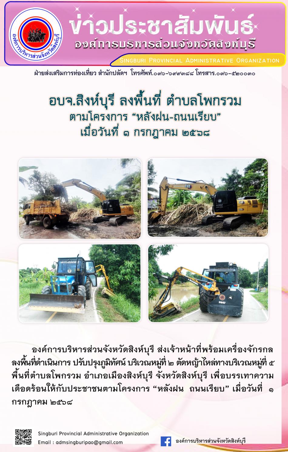 อบจ.สิงห์บุรี ลงพื้นที่ ตำบลโพกรวม ตามโครงการ "หลังฝน - ถนนเรียบ" [1 กรกฎาคม 2568]