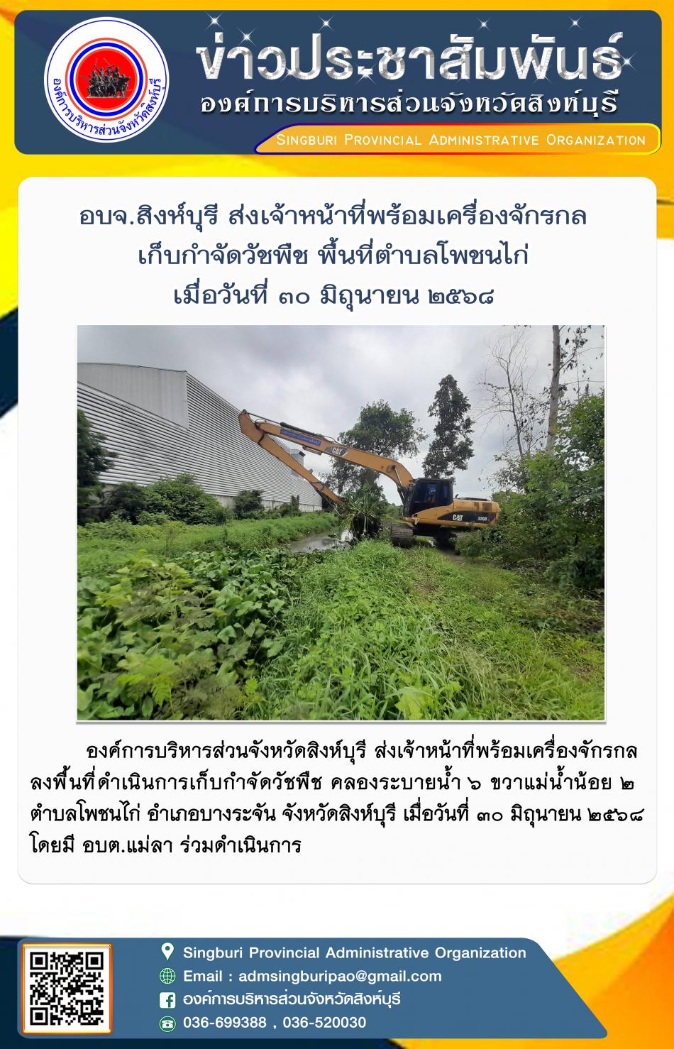 อบจ.สิงห์บุรี ส่งเจ้าหน้าที่พร้อมเครื่องจักรกล เก็บกำจัดวัชพืช พื้นที่ตำบลโพประจักษ์ [27 มิถุนายน 2568]