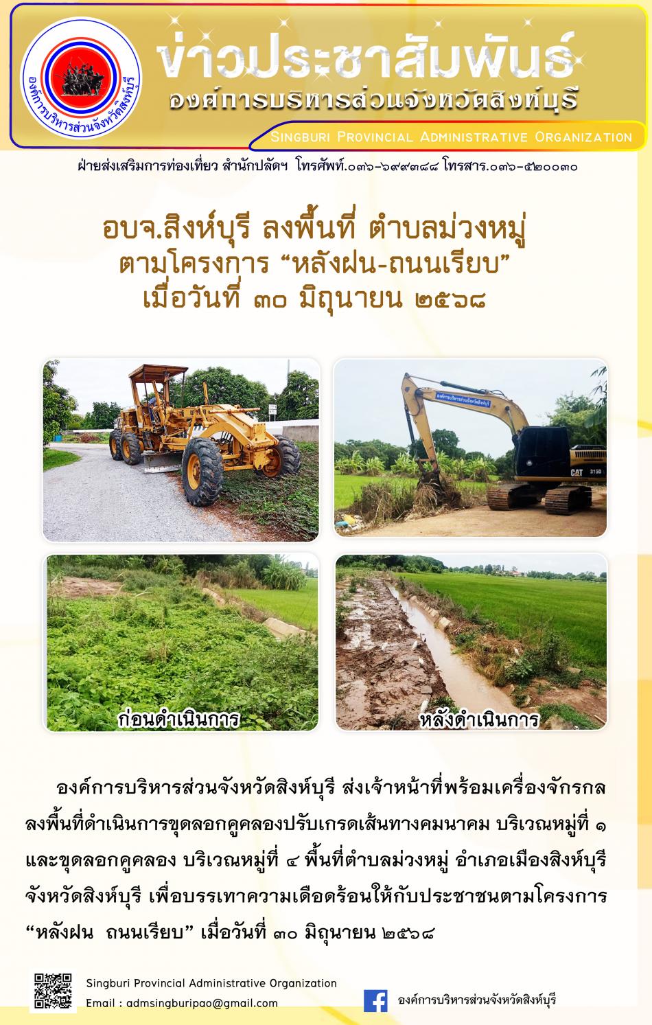 อบจ.สิงห์บุรี ลงพื้นที่ ตำบลม่วงหมู่ ตามโครงการ "หลังฝน - ถนนเรียบ" [27 มิถุนายน 2568]