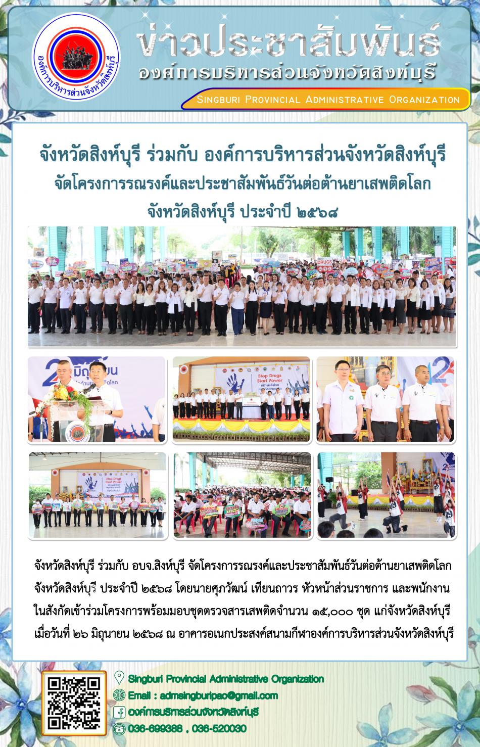 จังหวัดสิงห์บุรี ร่วมกับองค์การบริหารส่วนจังหวัดสิงห์บุรี จัดโครงการรณรงค์และประชาสัมพันธ์วันต่อต้านยาเสพติดโลก จังหวัดสิงห์บุรี ประจำปี 2568 [26 มิถุนายน 2568]