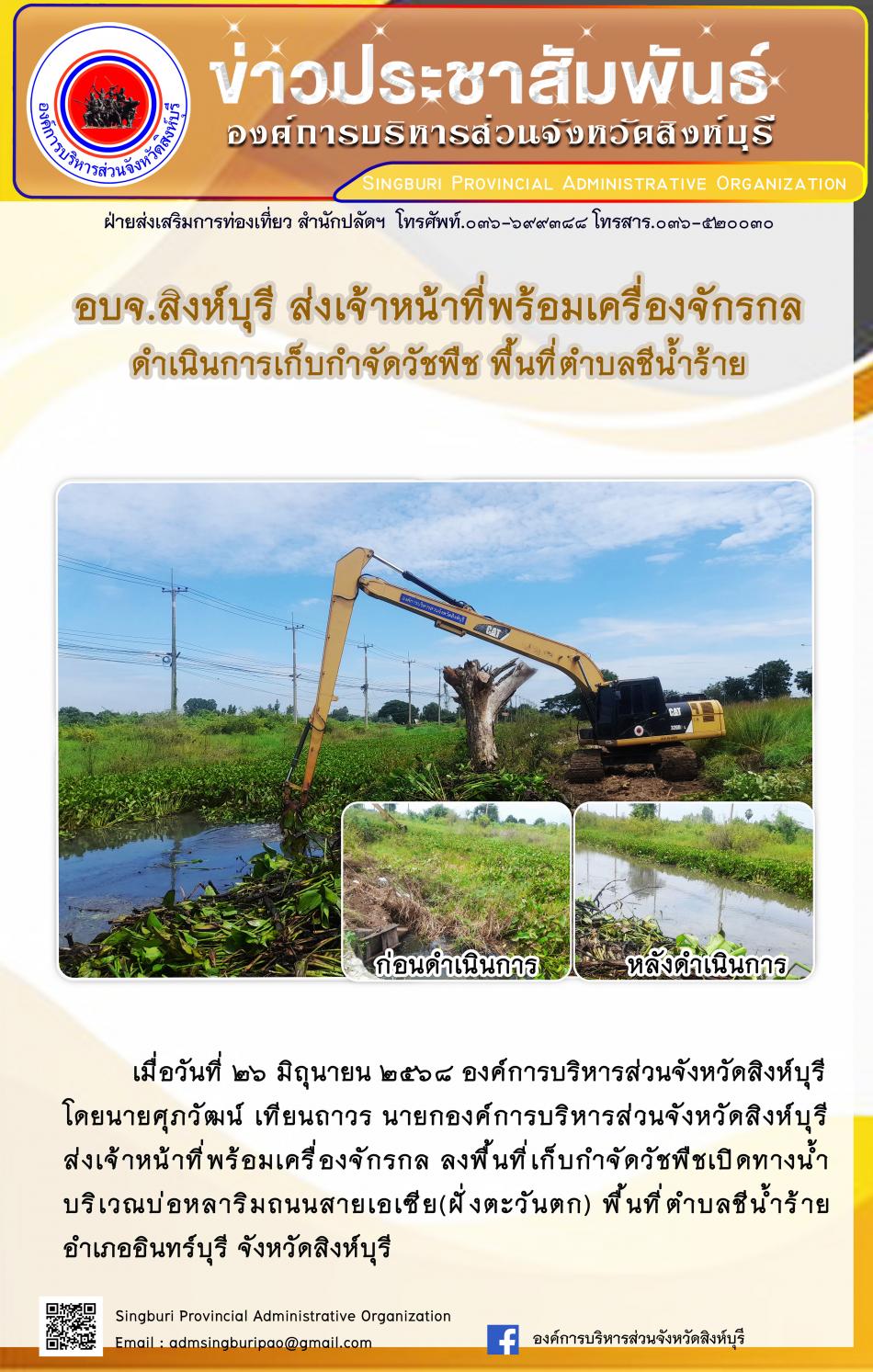 อบจ.สิงห์บุรี ส่งเจ้าหน้าที่พร้อมเครื่องจักรกล เก็บกำจัดวัชพืช พื้นที่ตำบลชีน้ำร้าย [26 มิถุนายน 2568]