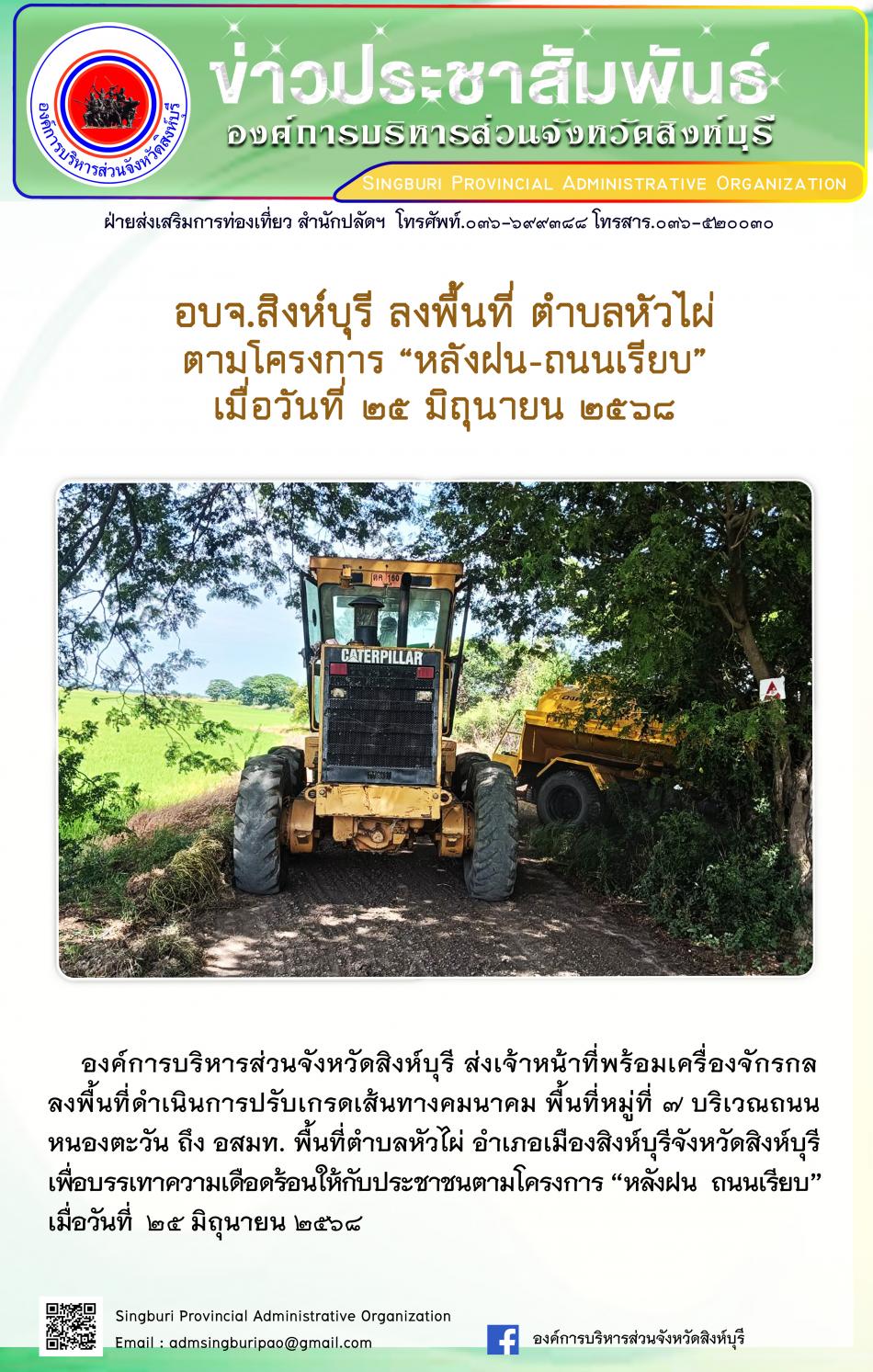 อบจ.สิงห์บุรี ลงพื้นที่ ตำบลหัวไผ่ ตามโครงการ "หลังฝน - ถนนเรียบ" [25 มิถุนายน 2568]