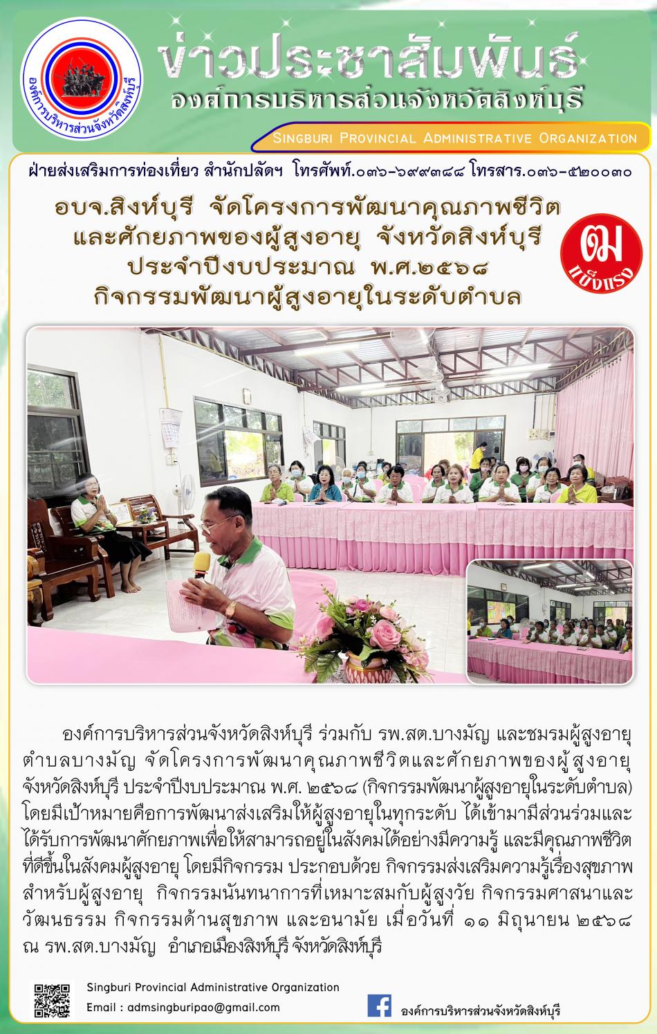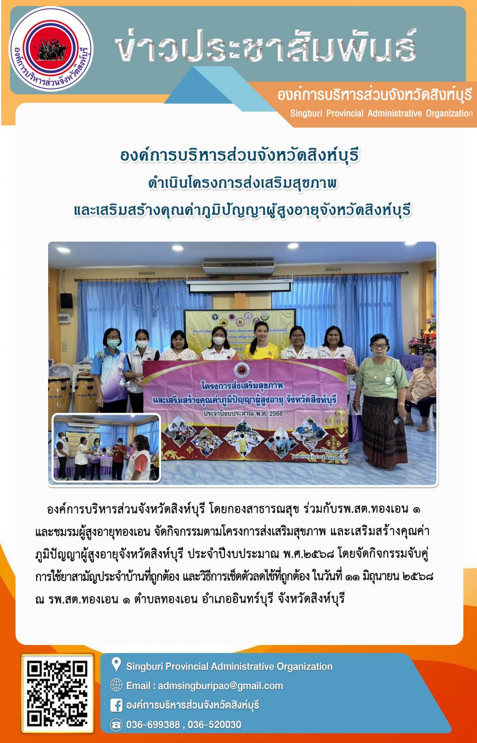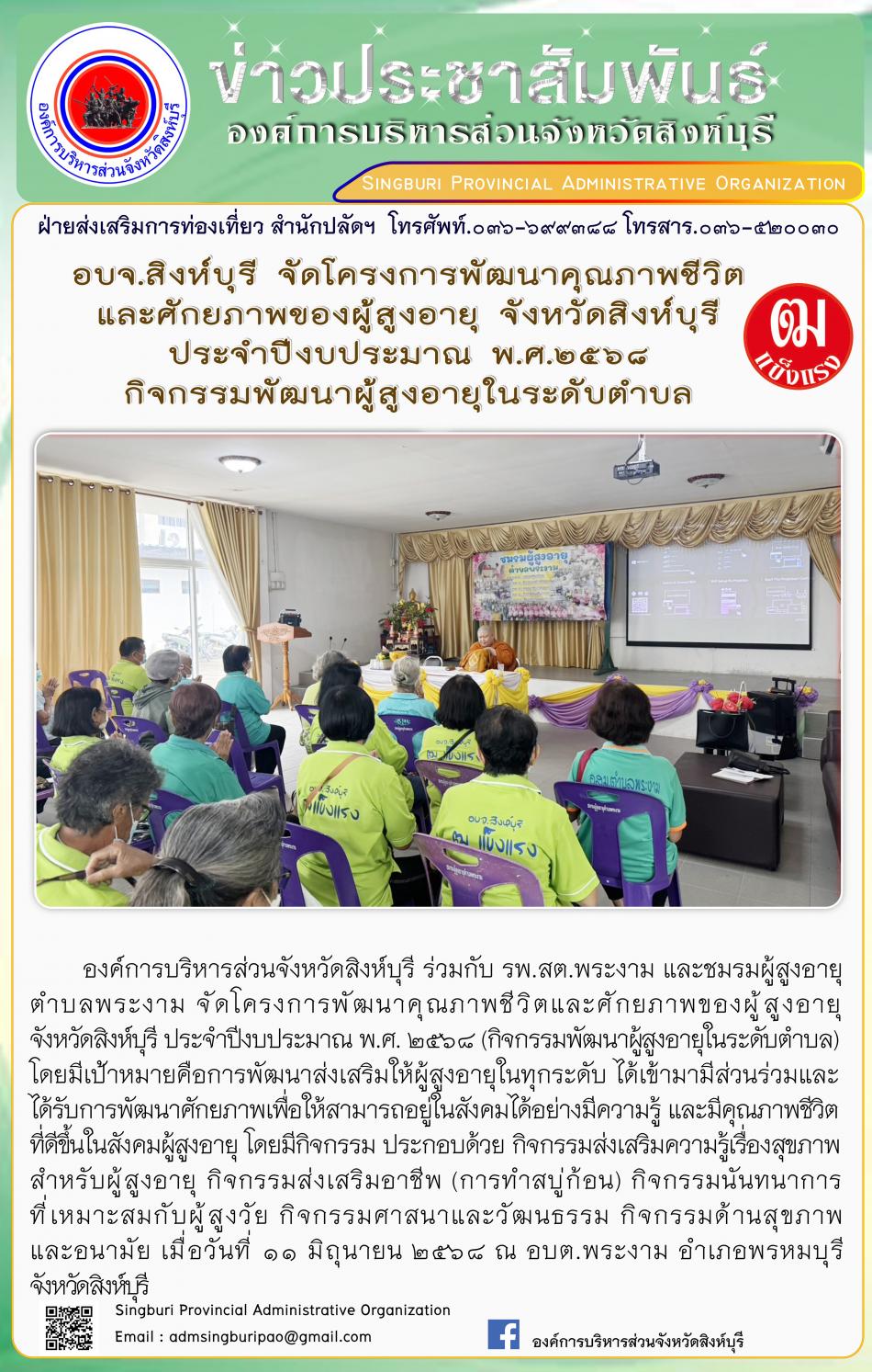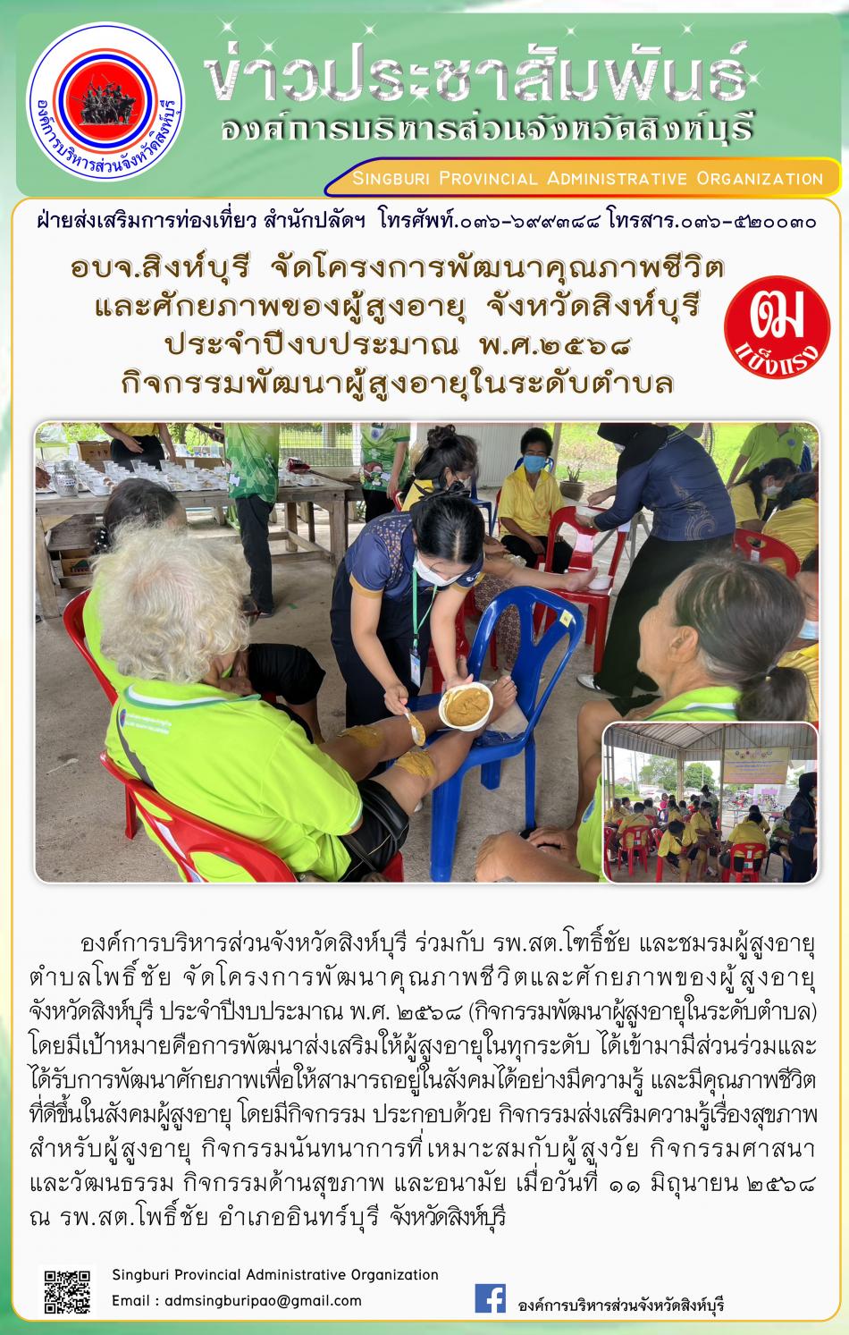 อบจ.สิงห์บุรี จัดโครงการพัฒนาคุณภาพชีวิตและศักยภาพผุ้สูงอายุจังหวัดสิงห์บุรี ประจำปีงบประมาณพ.ศ.2568 กิจกรรมพัฒนาผู้สูงอายุในระดับตำบล [11 มิถุนายน 2568]