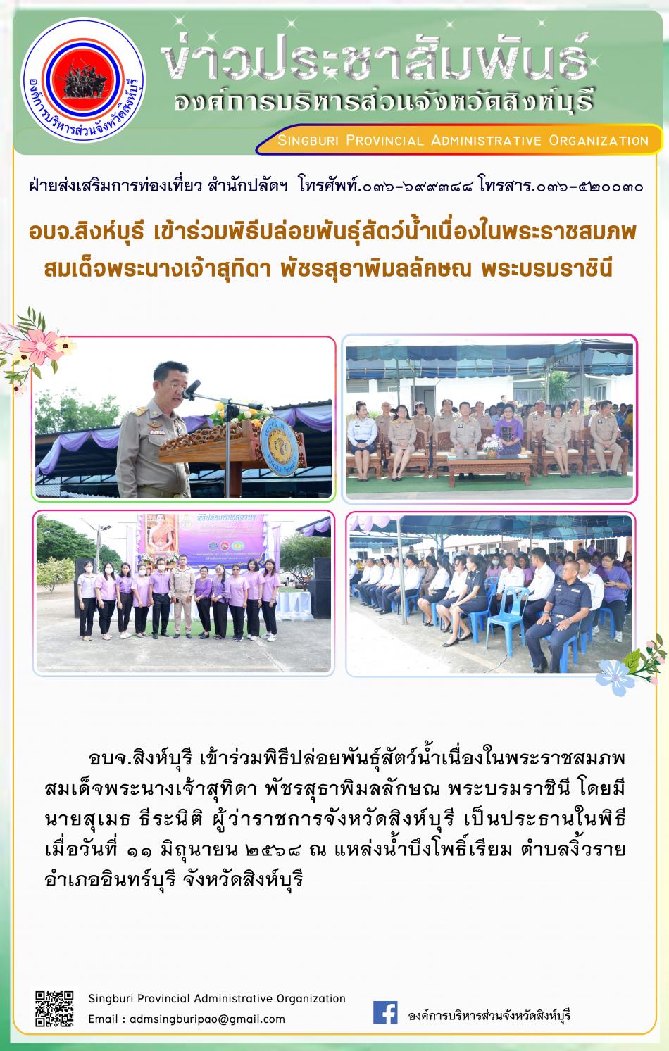 อบจ.สิงห์บุรี เข้าร่วมพิธีปล่อยพันธุ์สัตว์น้ำ เนื่องในวันเฉลิมพระชนมพรรษา สมเด็จพระนางเจ้าสุทิดา พัชรสุธาพิมลลักษณ พระบรมราชินี [11 มิถุนายน 2568]
