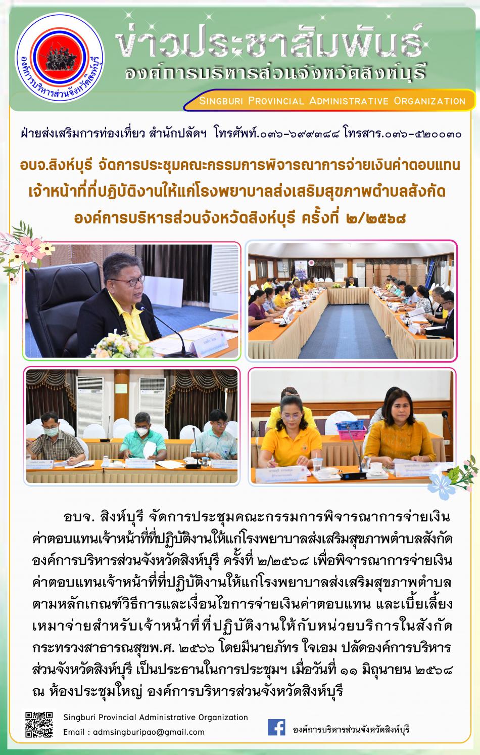 อบจ.สิงห์บุรี จัดการประชุมคณะกรรมการพิจารณาจ่ายเงินค่าตอบแทนเจ้าหน้าที่ที่ปฏิบัติงานให้แก่โรงพยาบาลส่งเสริมสุขภาพตำบลสังกัดองค์การบริหารส่วนจังหวัดสิงห์บุรี ครั้งที่ 2/2568 [11 มิถุนายน 2568]