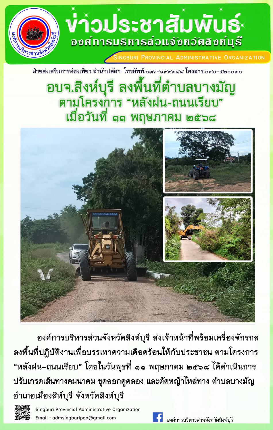 อบจ.สิงห์บุรี ลงพื้นที่ ตำบลบางมัญ ตามโครงการ "หลังฝน - ถนนเรียบ" [11 มิถุนายน 2568]