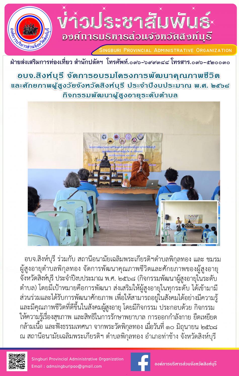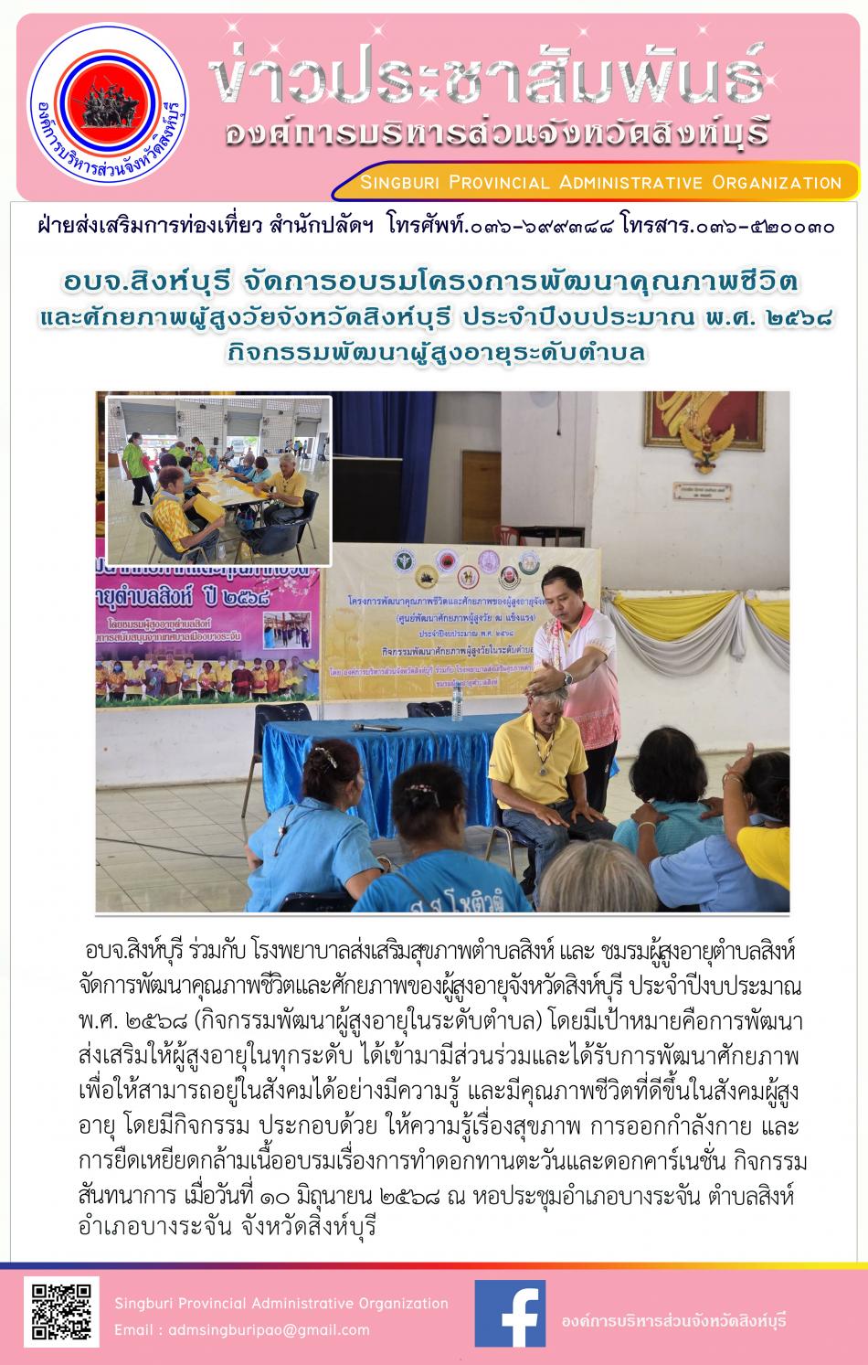 อบจ.สิงห์บุรี จัดโครงการพัฒนาคุณภาพชีวิตและศักยภาพผุ้สูงอายุจังหวัดสิงห์บุรี ประจำปีงบประมาณพ.ศ.2568 กิจกรรมพัฒนาผู้สูงอายุในระดับตำบล [10 มิถุนายน 2568]