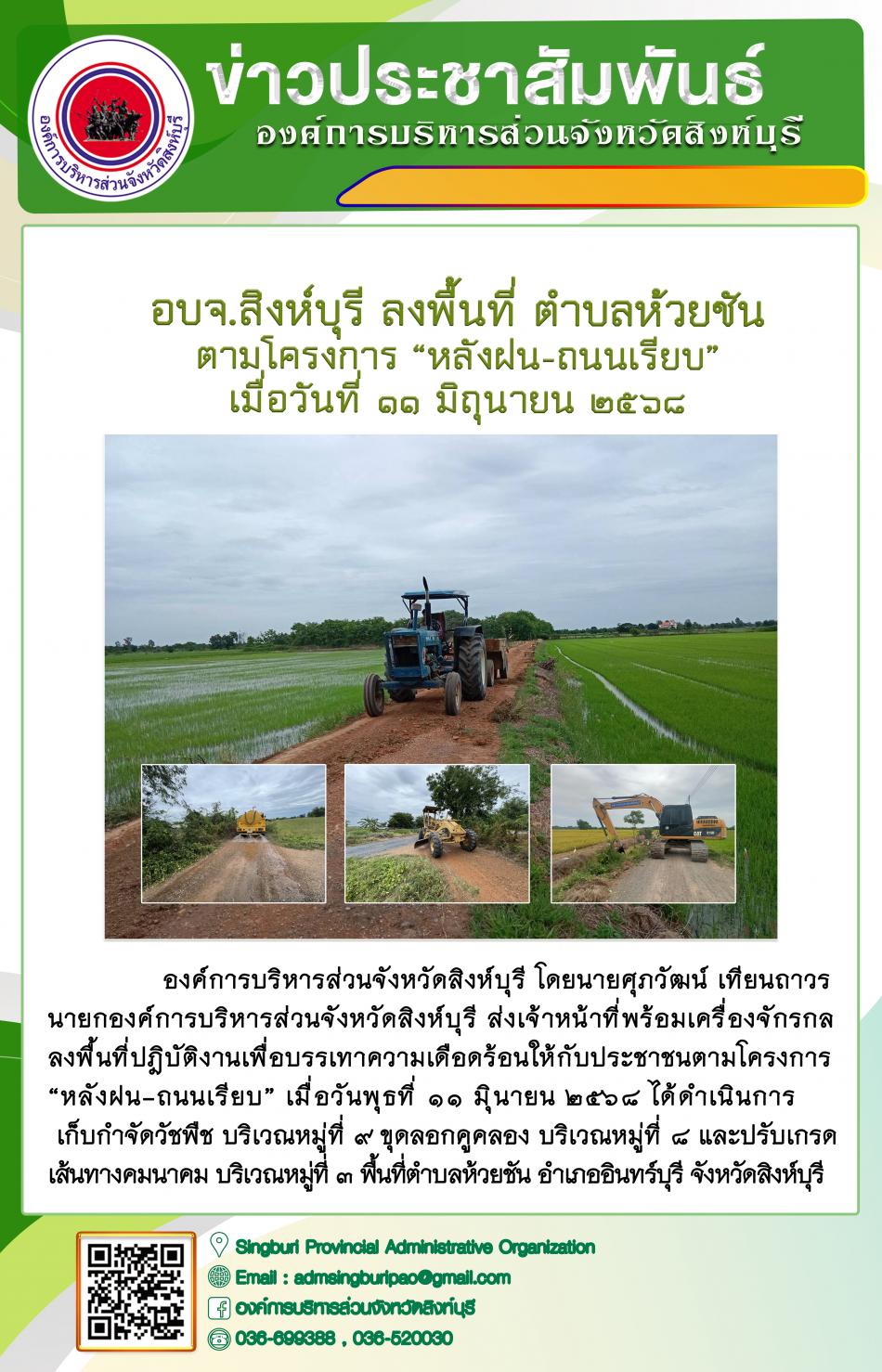 อบจ.สิงห์บุรี ลงพื้นที่ ตำบลห้วยชัน ตามโครงการ "หลังฝน - ถนนเรียบ" [11 มิถุนายน 2568]