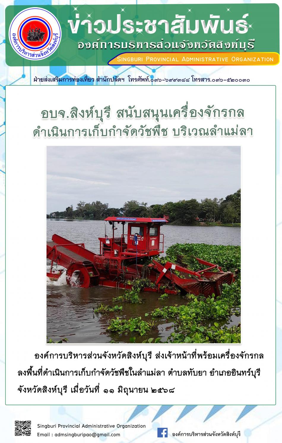 อบจ.สิงห์บุรี ส่งเจ้าหน้าที่พร้อมเครื่องจักรกล เก็บกำจัดวัชพืช บริเวณลำแม่ลา [11 มิถุนายน 2568]