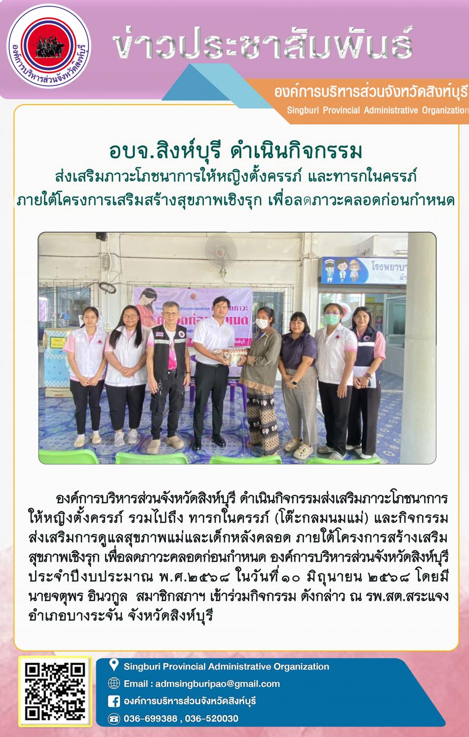 อบจ.สิงห์บุรี ดำเนินกิจกรรมส่งเสริมภาวะโภชนาการให้หญิงตั้งครรภ์ และทารกในครรภ์ภายใต้โครงการเสริมสร้างสุขภาพเชิงรุก เพื่อลดภาวะคลอดก่อนกำหนด [10 มิถุนายน 2568]