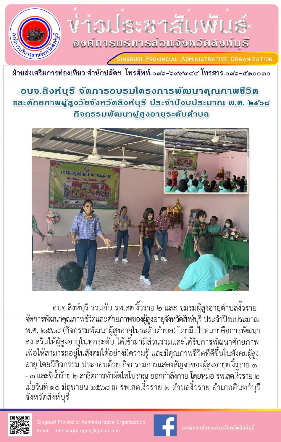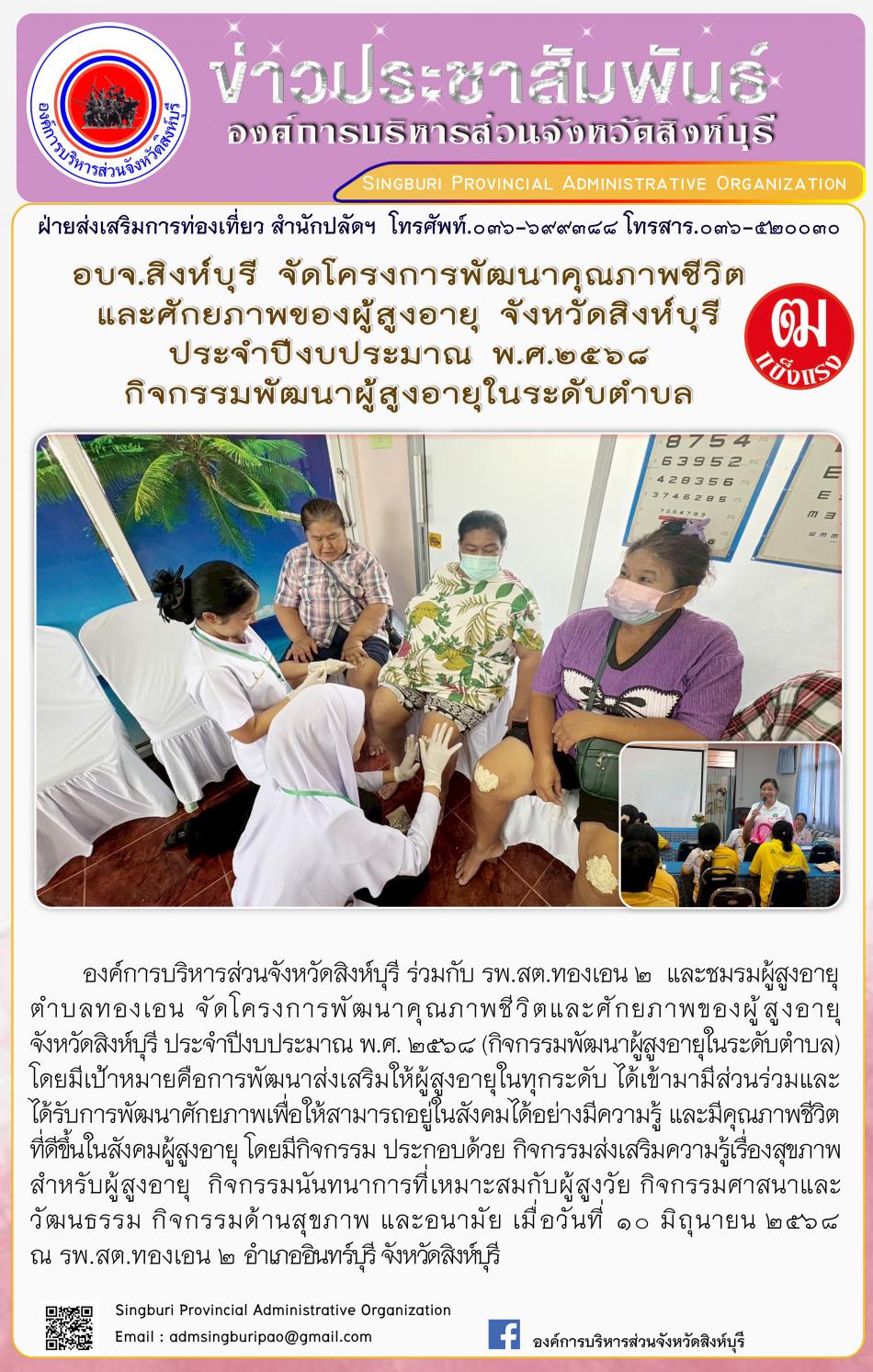 อบจ.สิงห์บุรี จัดโครงการพัฒนาคุณภาพชีวิตและศักยภาพผุ้สูงอายุจังหวัดสิงห์บุรี ประจำปีงบประมาณพ.ศ.2568 กิจกรรมพัฒนาผู้สูงอายุในระดับตำบล [10 มิถุนายน 2568]