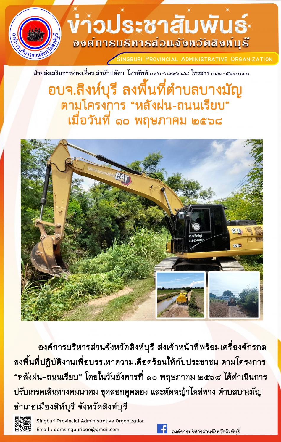 อบจ.สิงห์บุรี ลงพื้นที่ ตำบลบางมัญ ตามโครงการ "หลังฝน - ถนนเรียบ" [10 มิถุนายน 2568]